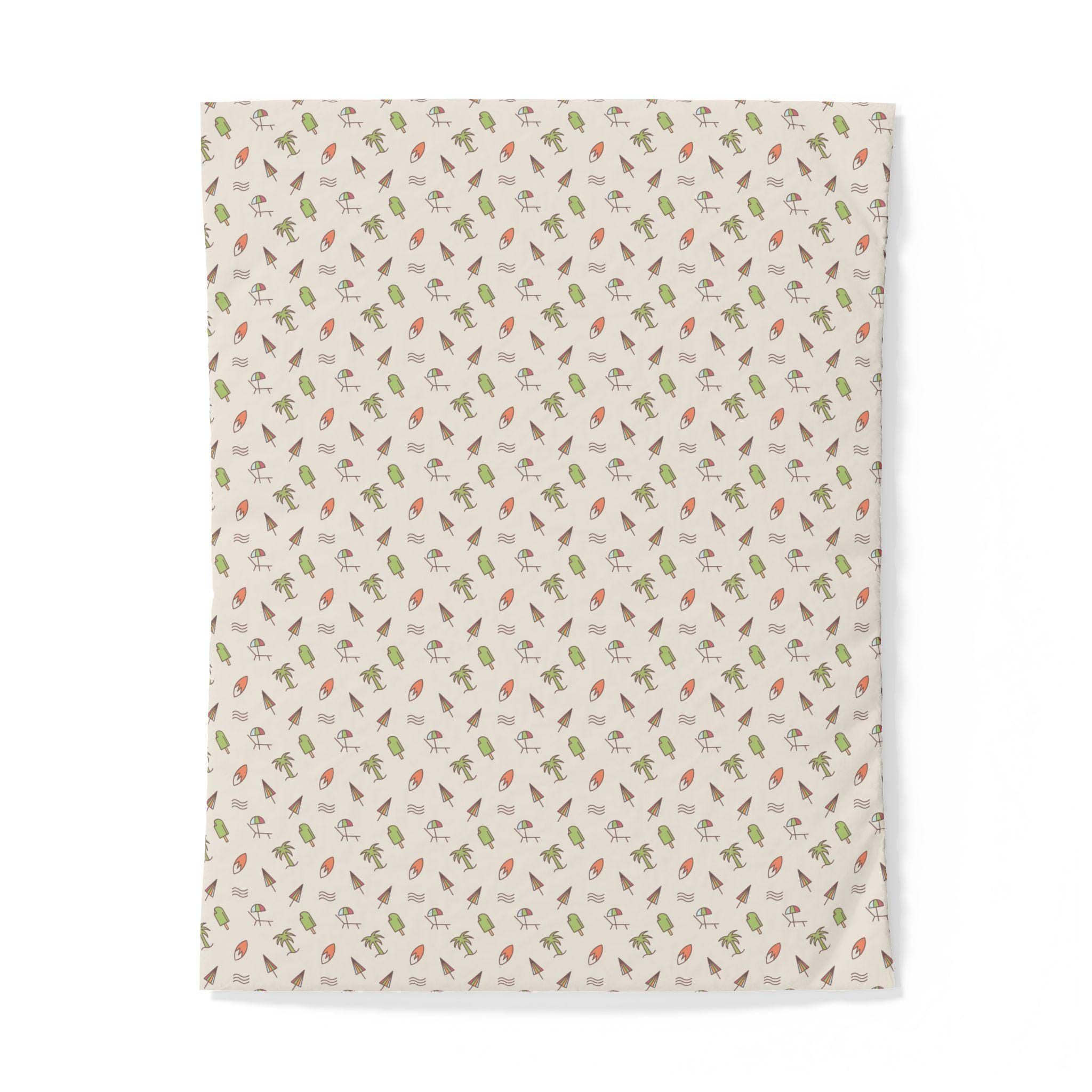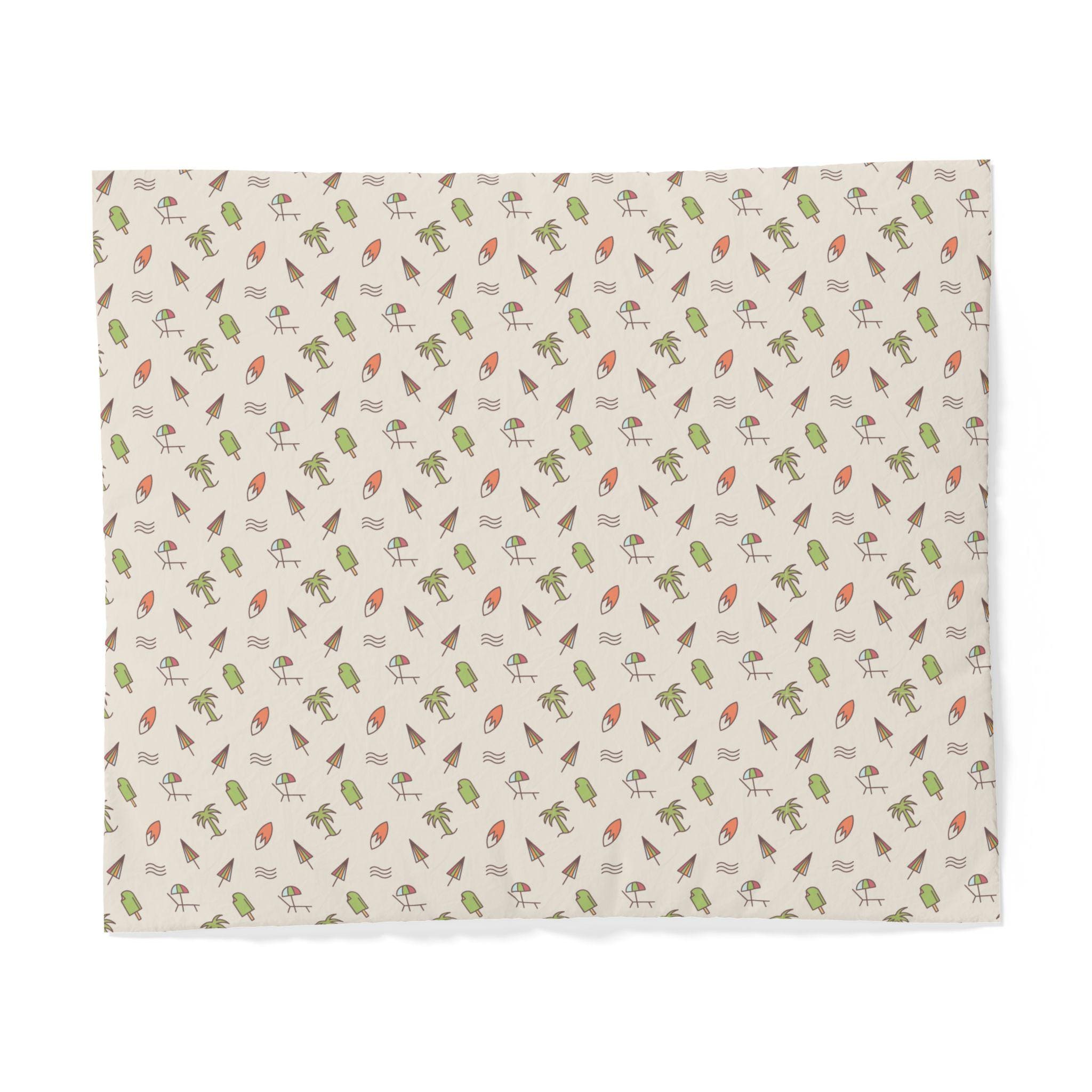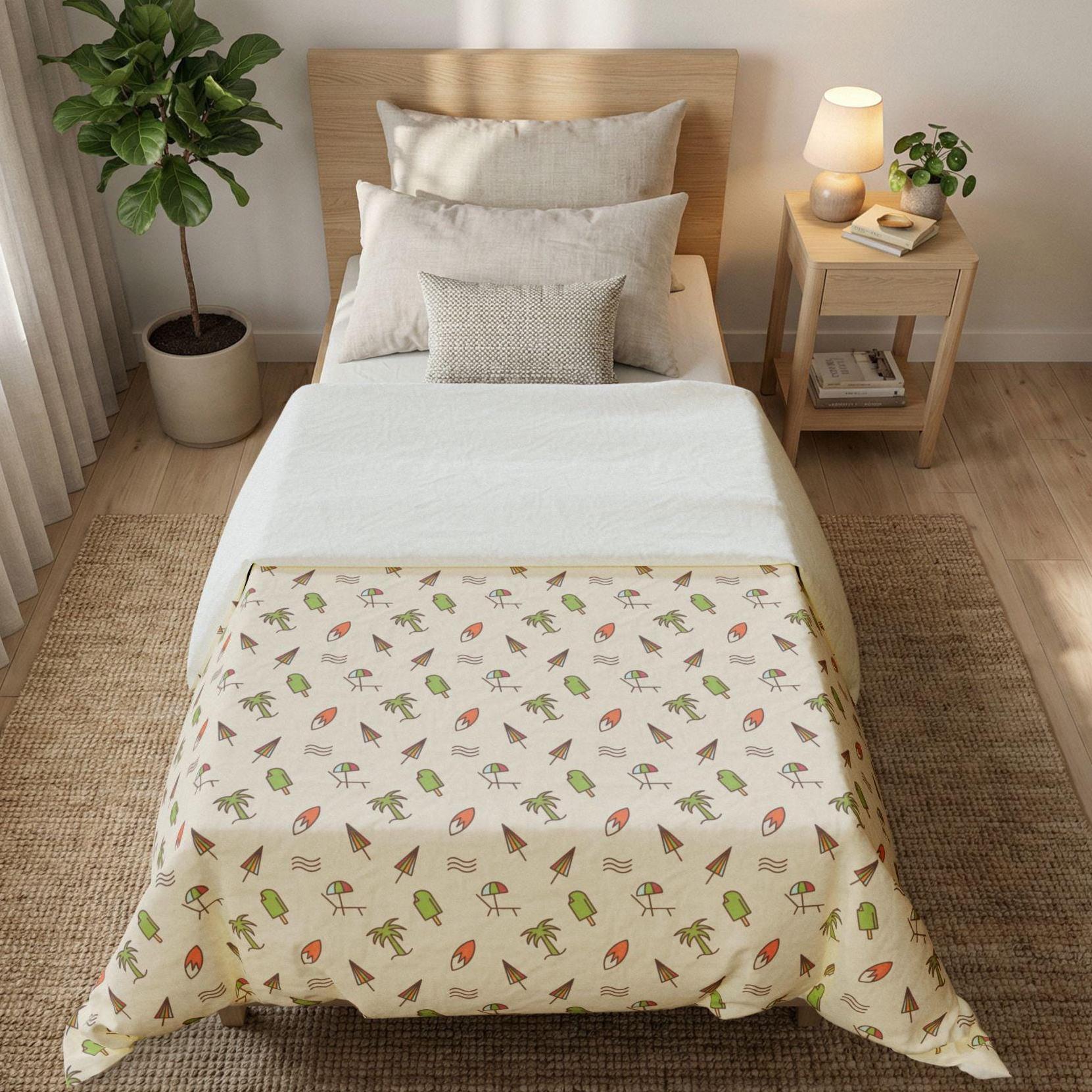 This retro beach duvet cover features a playful summer pattern with palm trees, surfboards, popsicles, beach umbrellas, and ocean wave icons on a soft neutral background. It’s the perfect statement piece for coastal bedrooms, beach house decor, dorm rooms, teen spaces, or anyone who lives for summer vibes year-round.