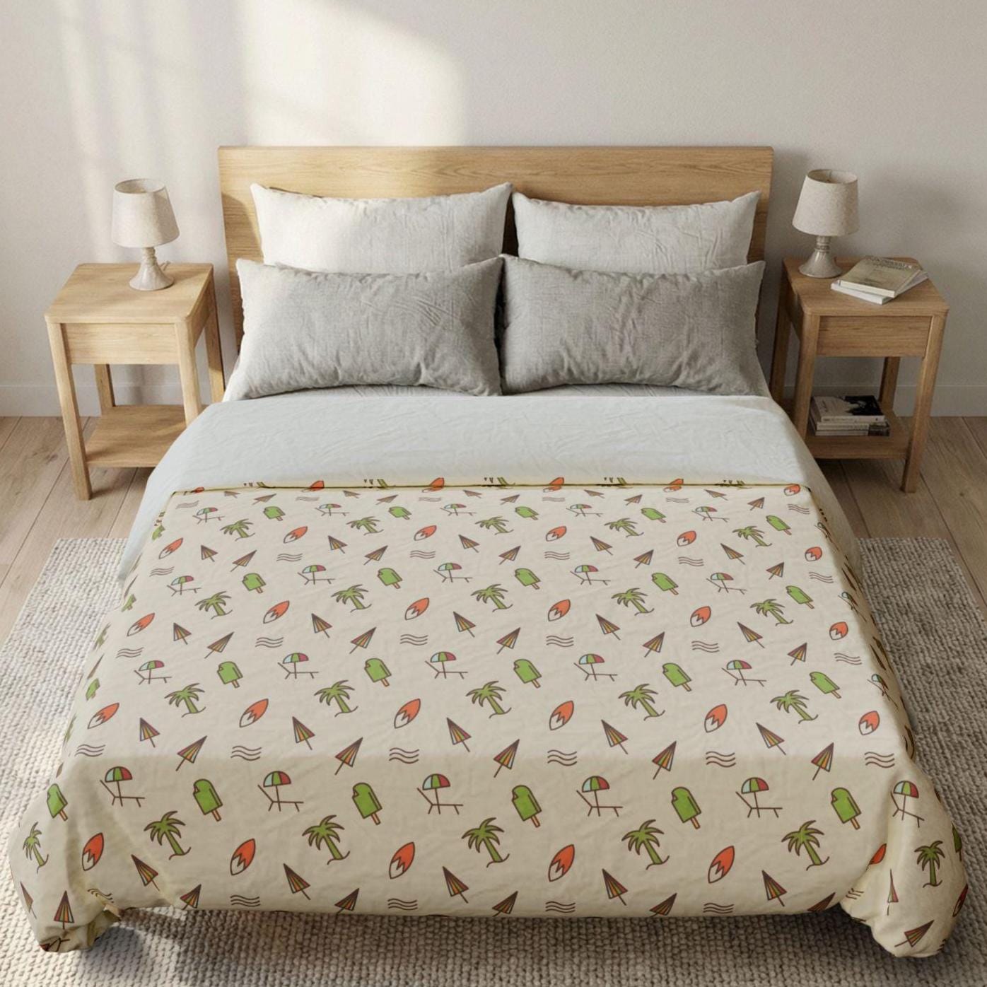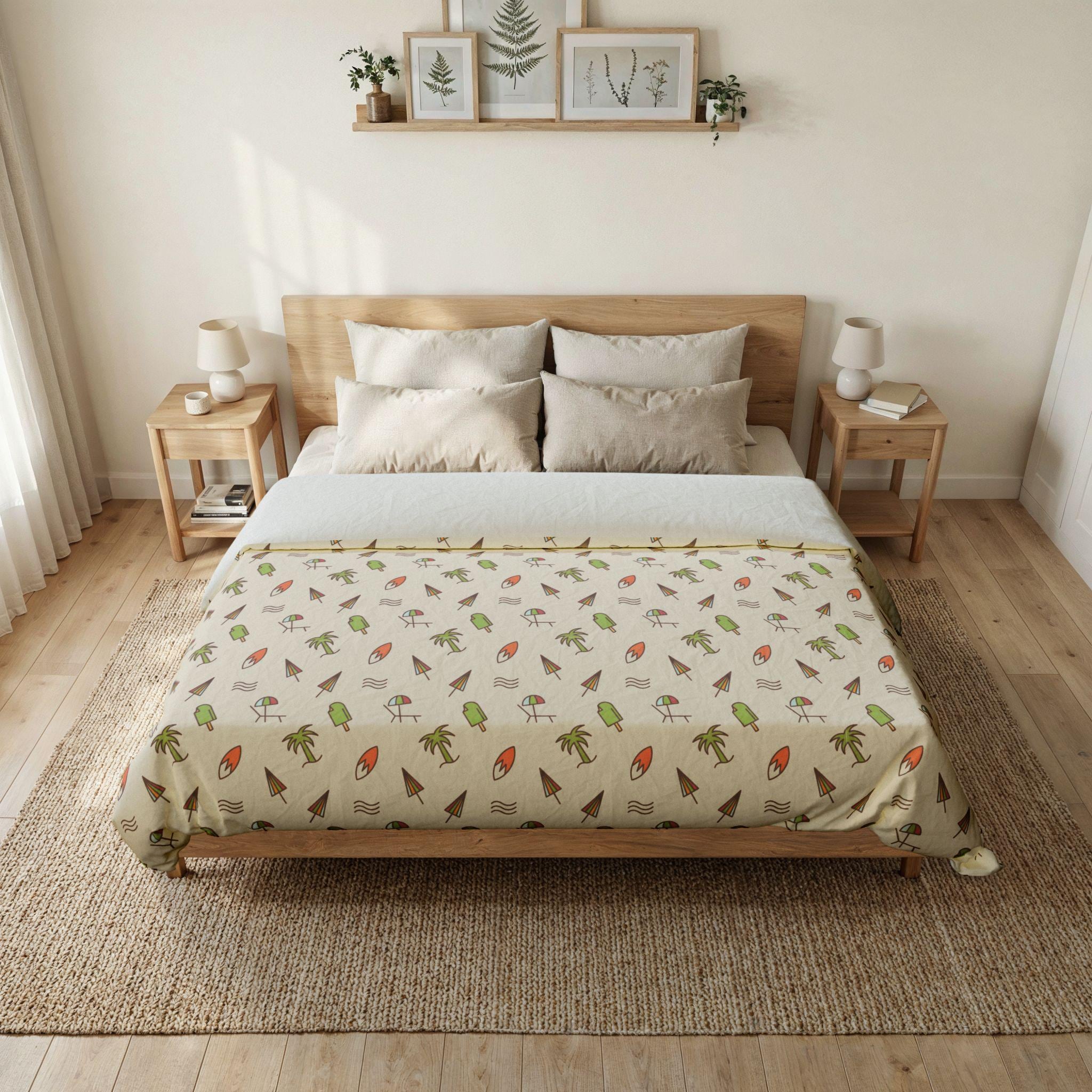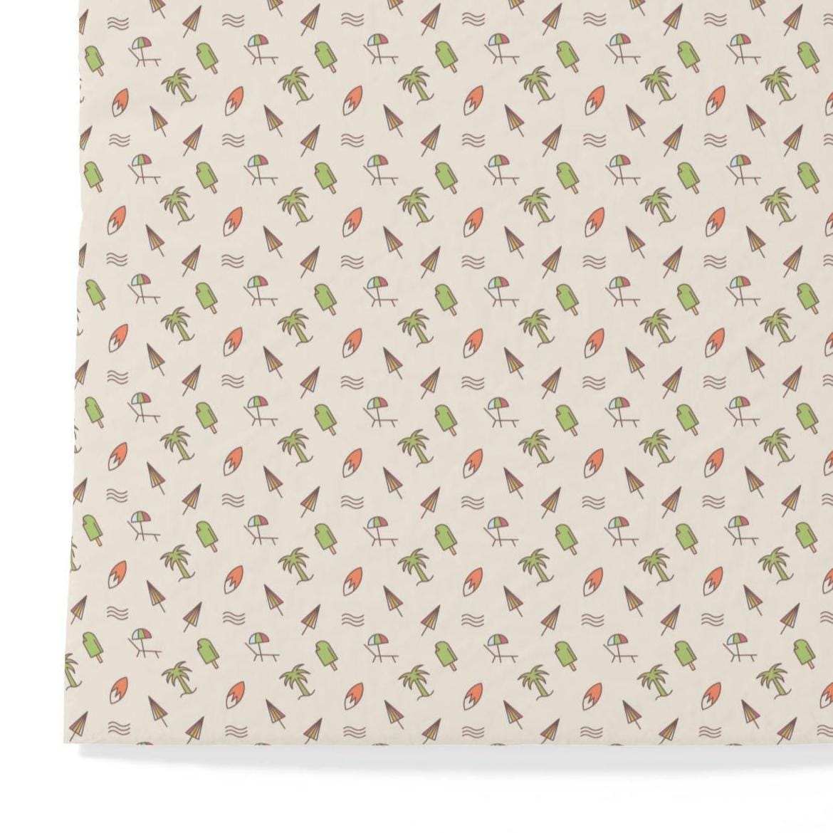 Bring playful coastal charm to your bedroom with this retro beach duvet cover made from 100% Oeko-Tex certified cotton. Featuring palm trees, popsicles, surfboards, and sunny summer icons in a seamless pattern, this breathable cotton duvet cover adds fun vacation vibes to any space.