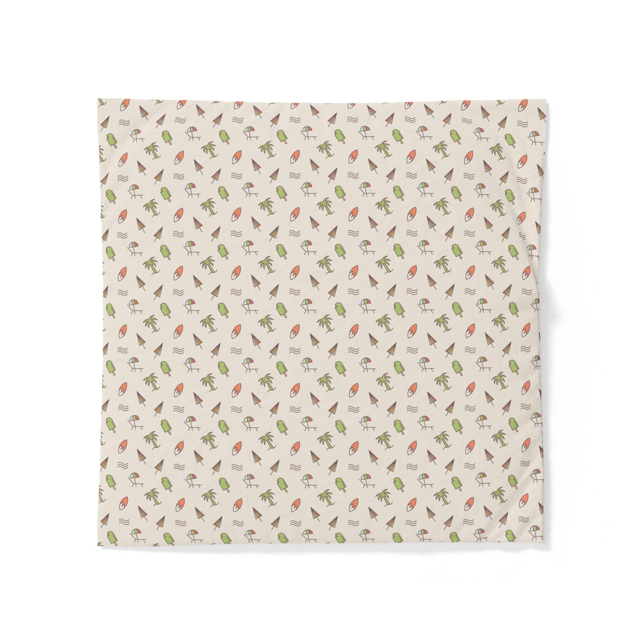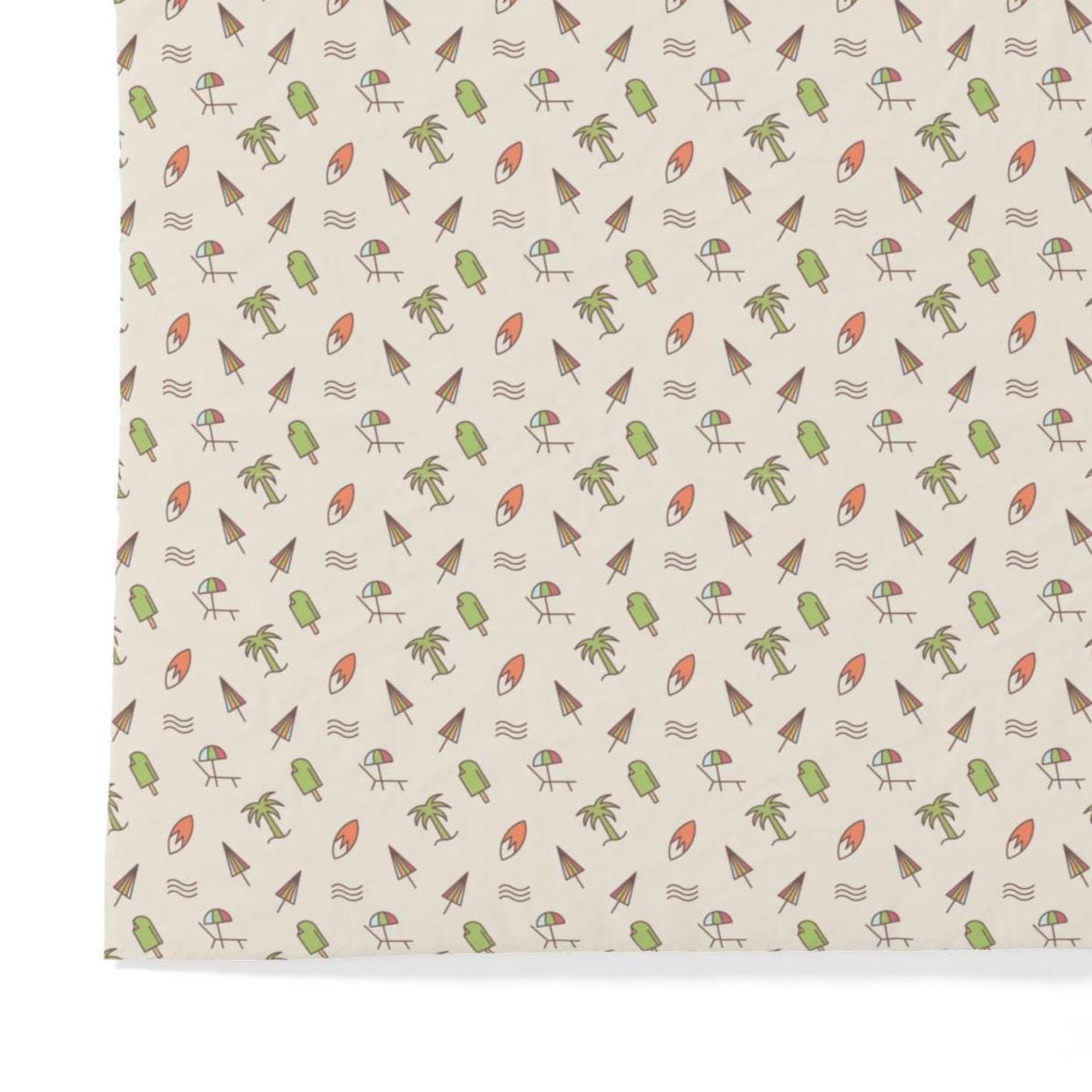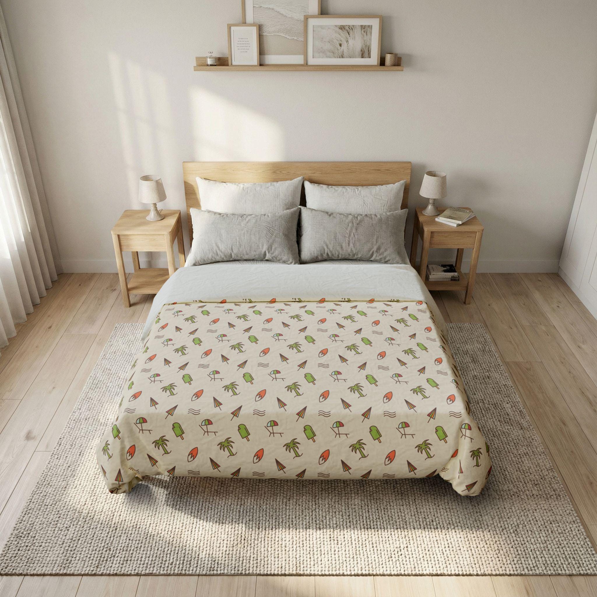 Bring playful coastal charm to your bedroom with this retro beach duvet cover made from 100% Oeko-Tex certified cotton. Featuring palm trees, popsicles, surfboards, and sunny summer icons in a seamless pattern, this breathable cotton duvet cover adds fun vacation vibes to any space.