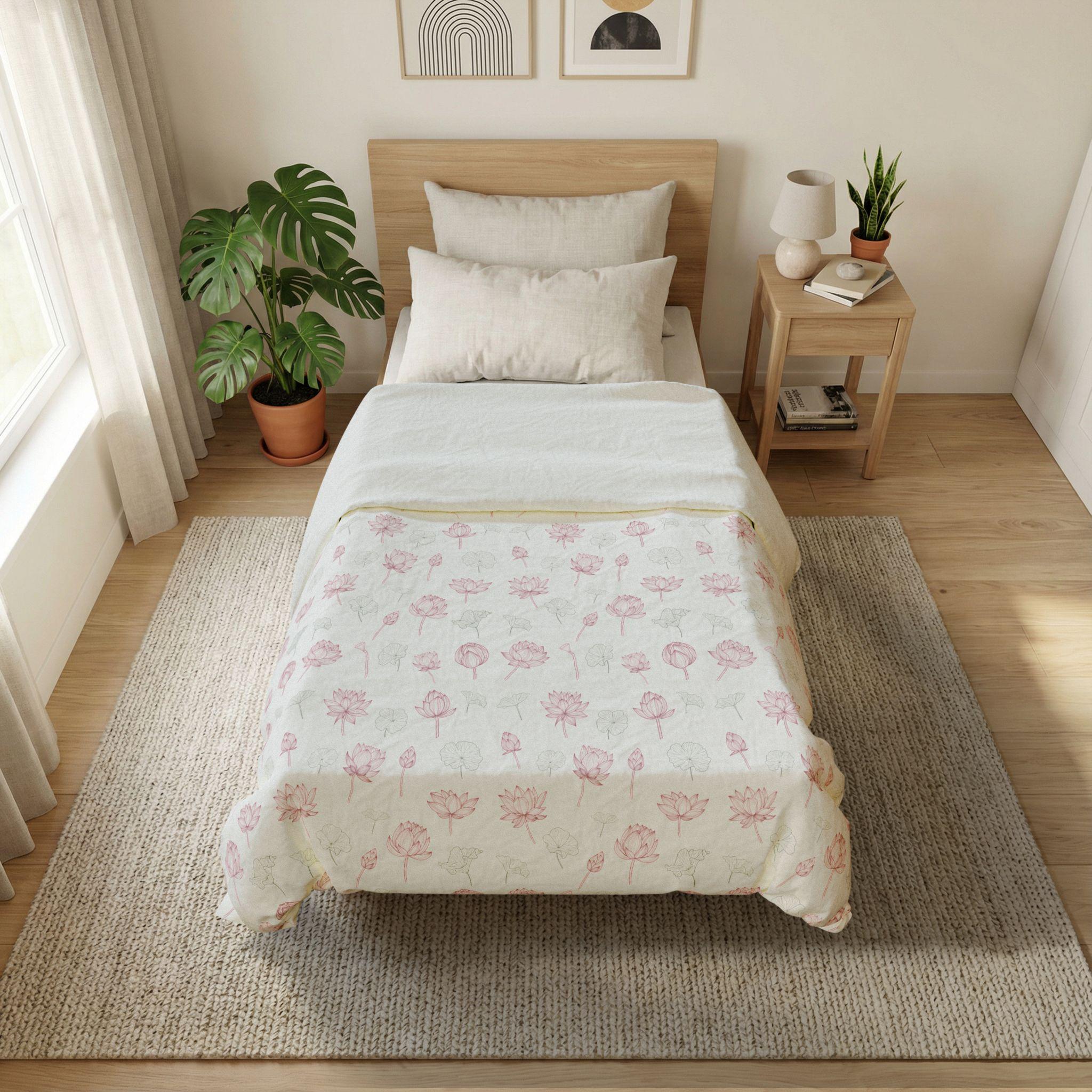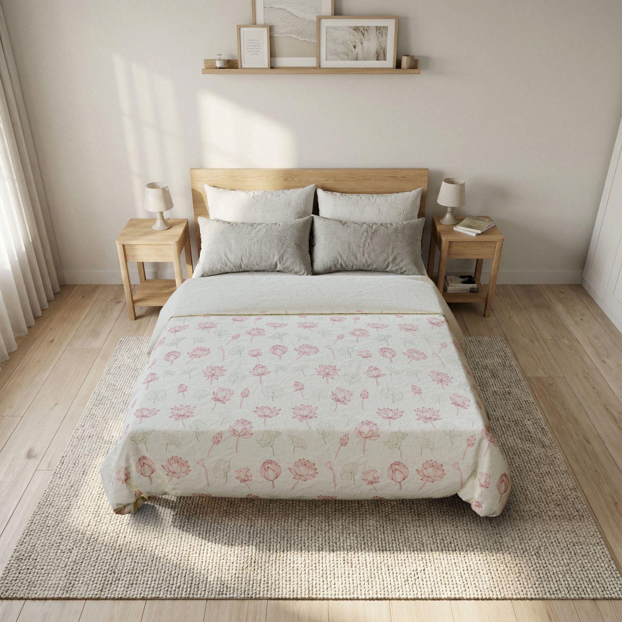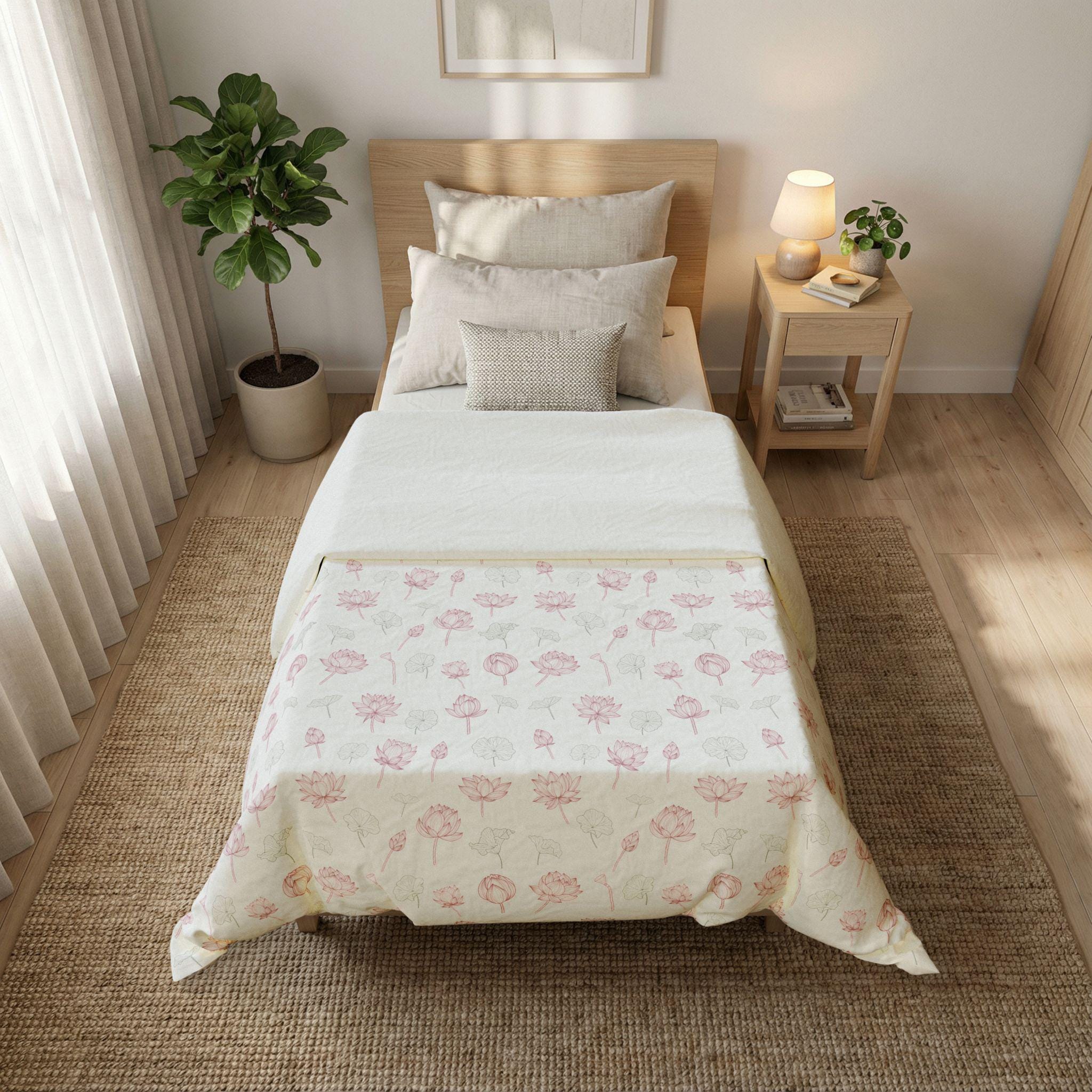 This Blush Lotus duvet cover features a delicate repeating pattern of soft pink lotus blooms and subtle botanical linework set against a clean, neutral background. The design brings gentle femininity and modern simplicity to your bedroom without overwhelming the space.