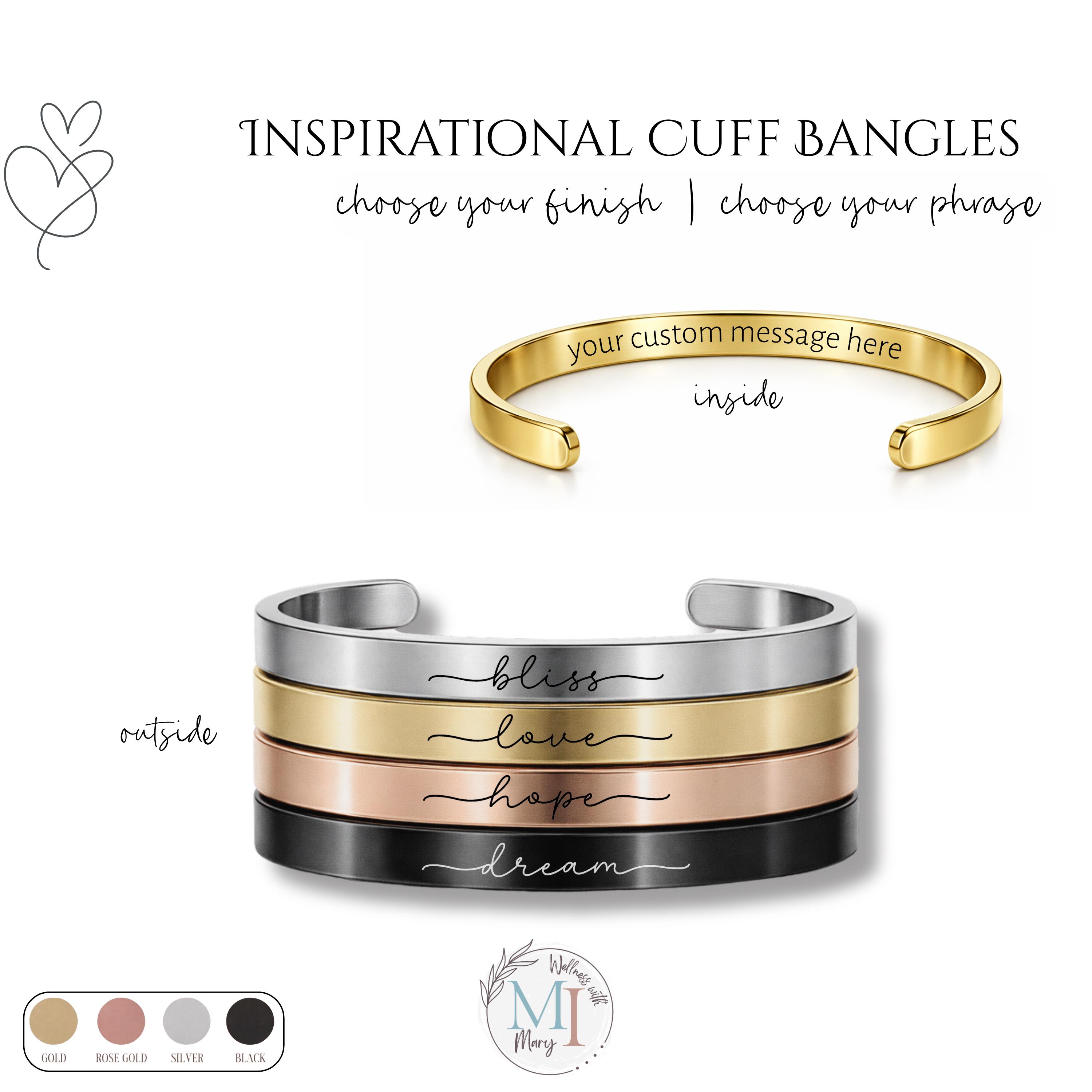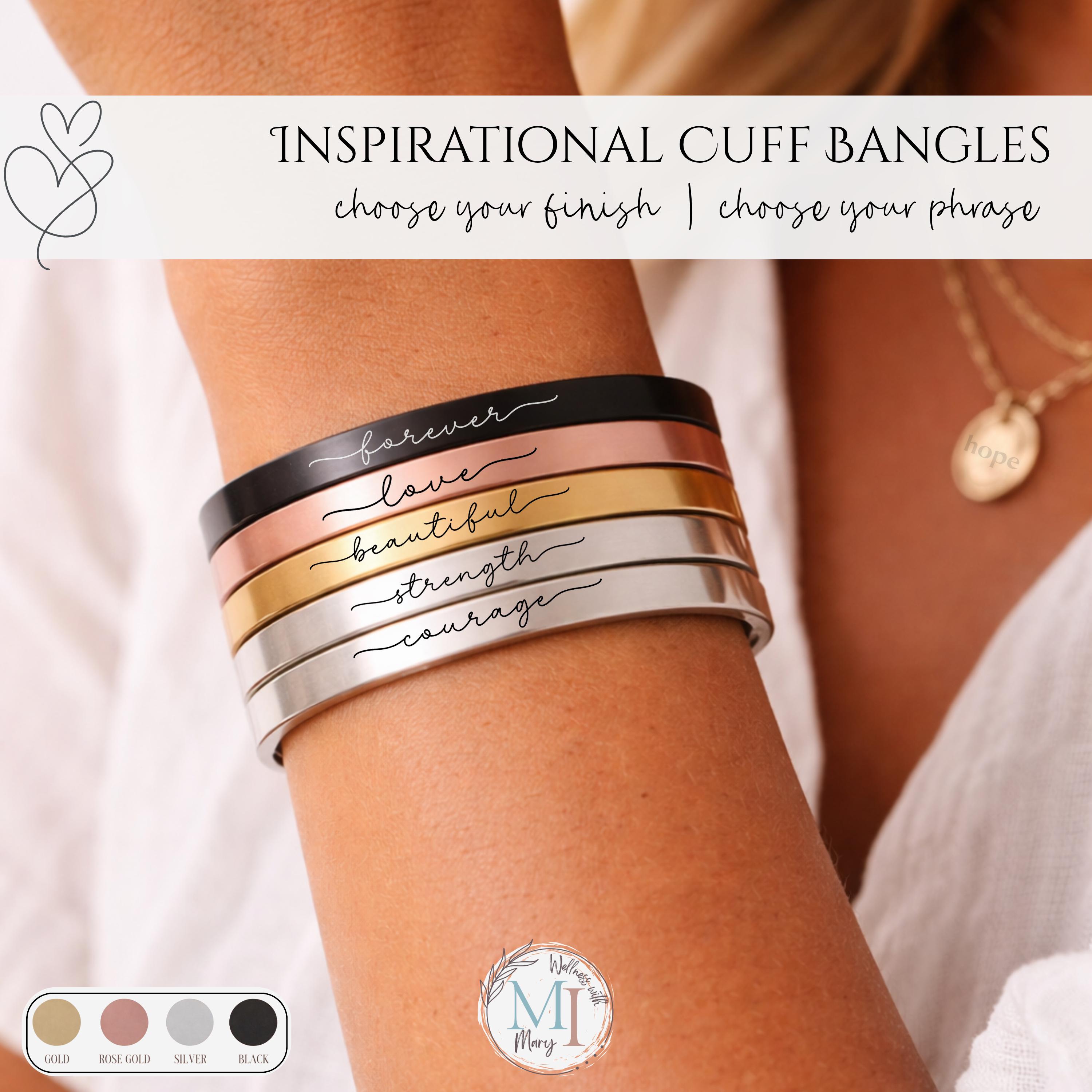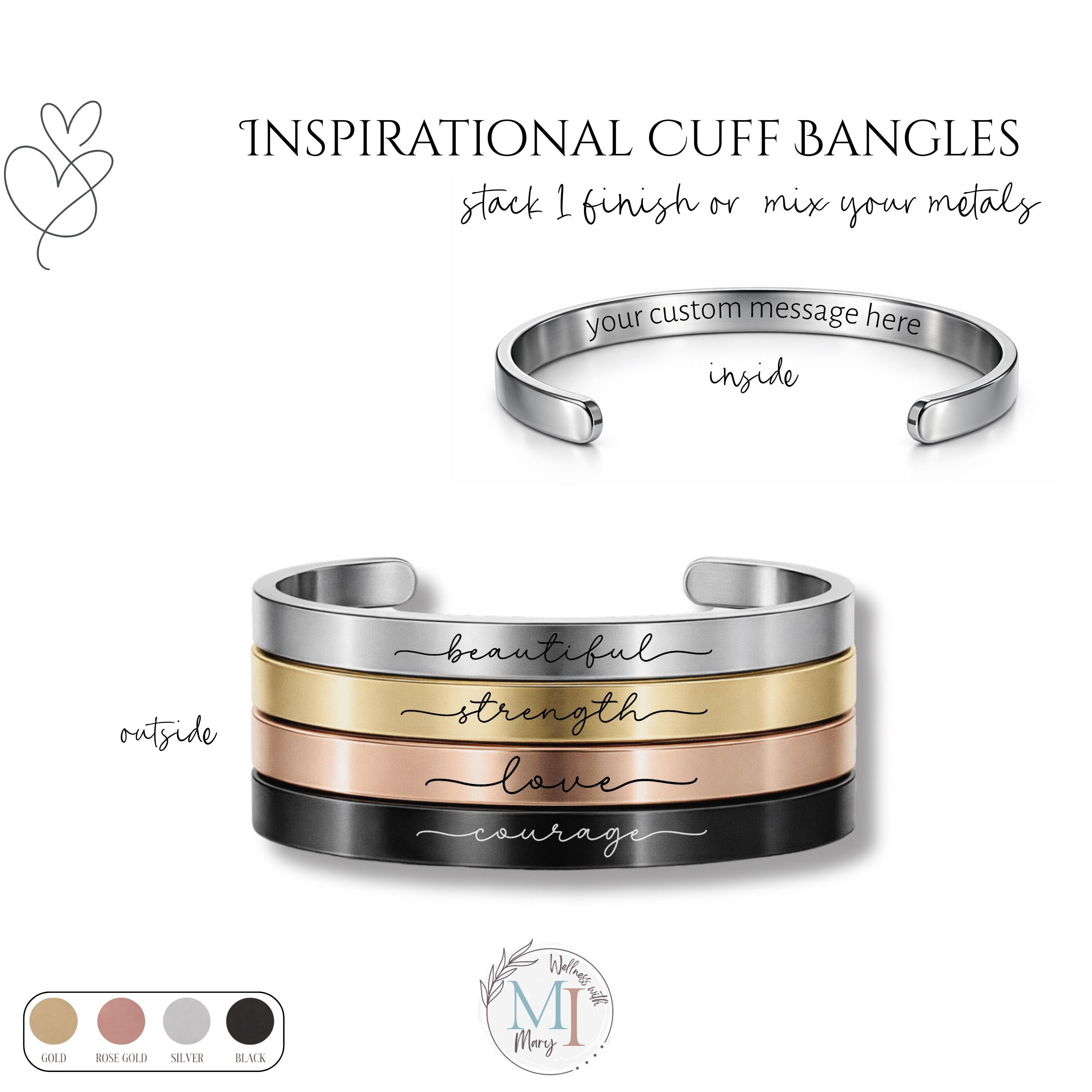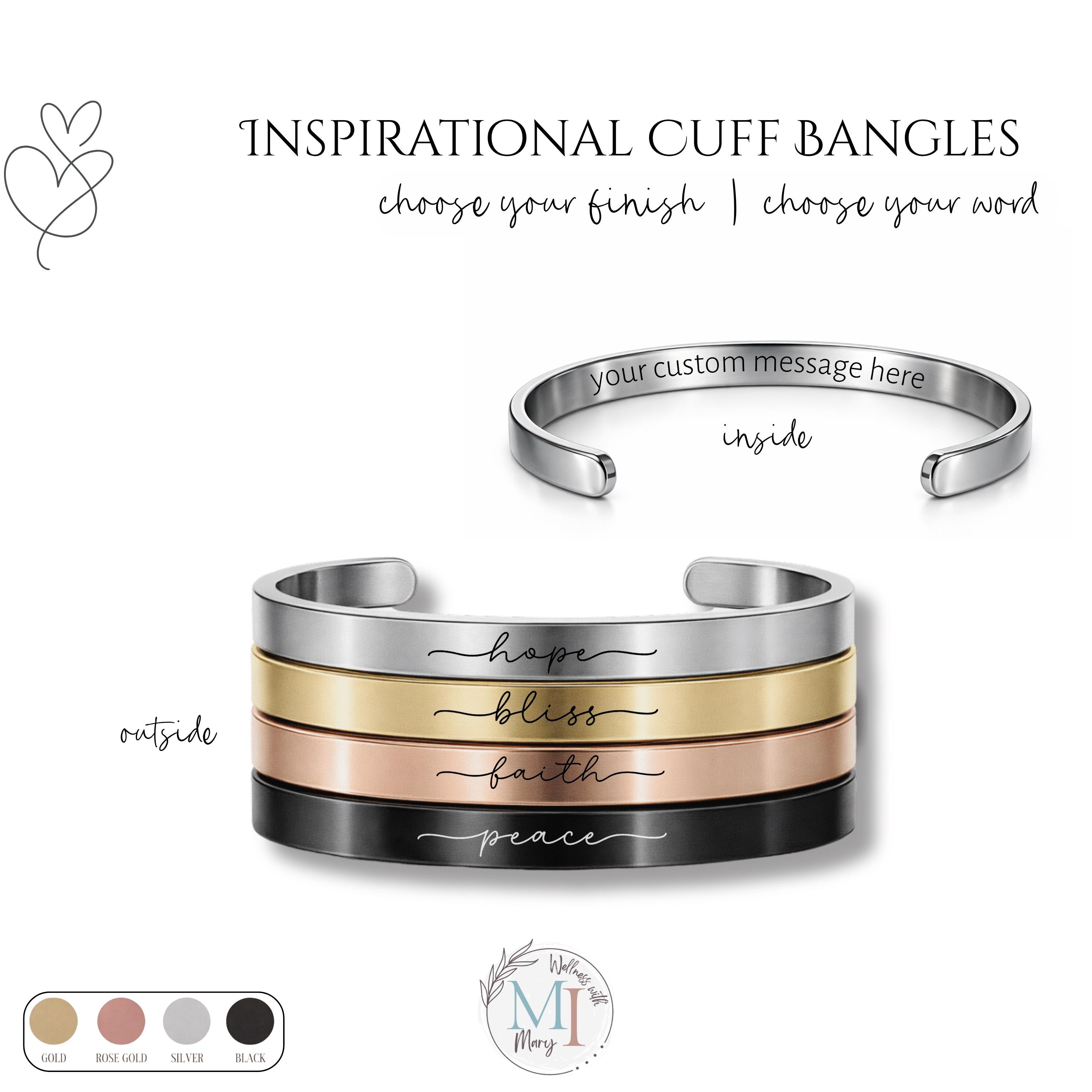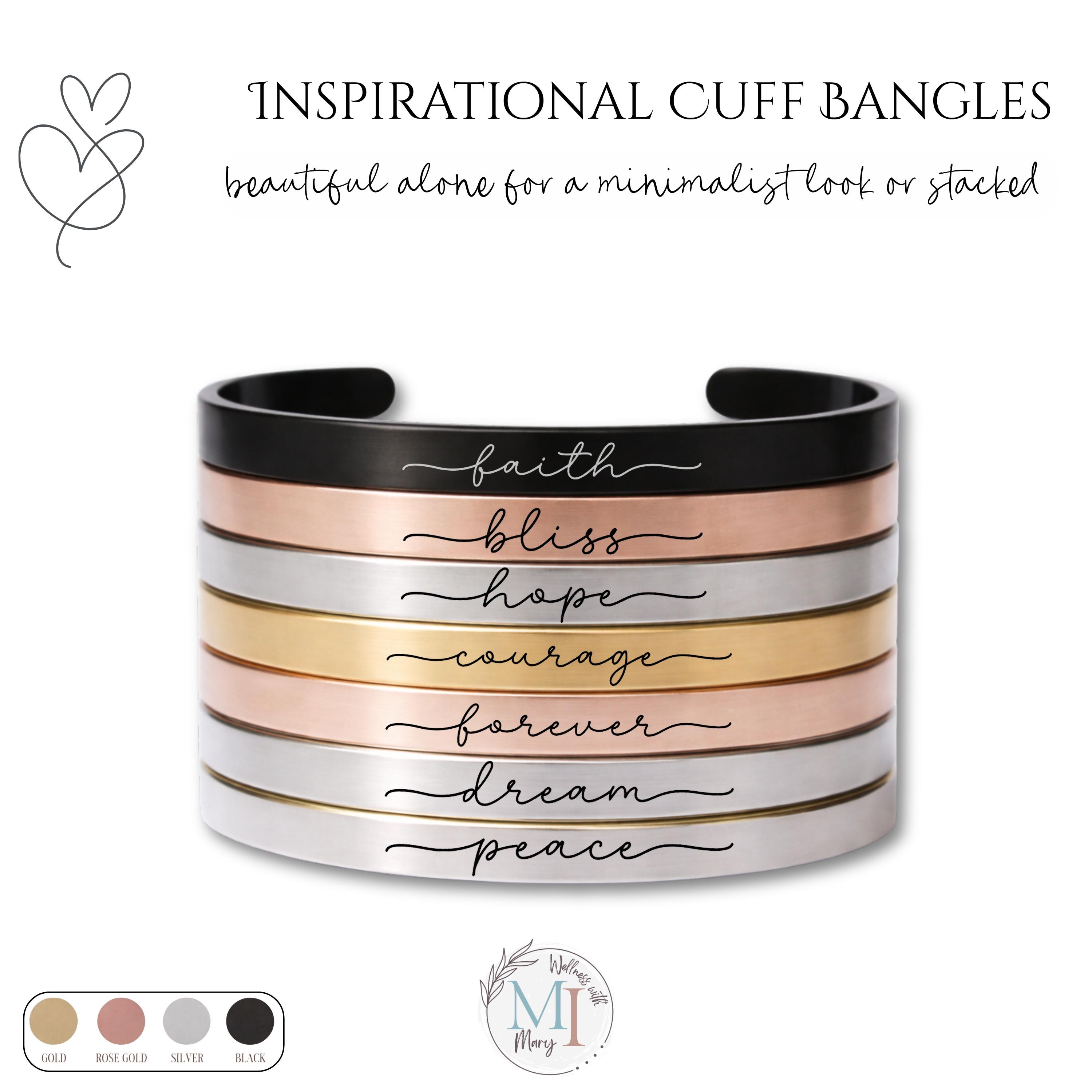 These minimalist 6mm cuff bangles are engraved with your choice of an inspiring word, creating a meaningful, wearable affirmation you (or someone you love) can carry every day.