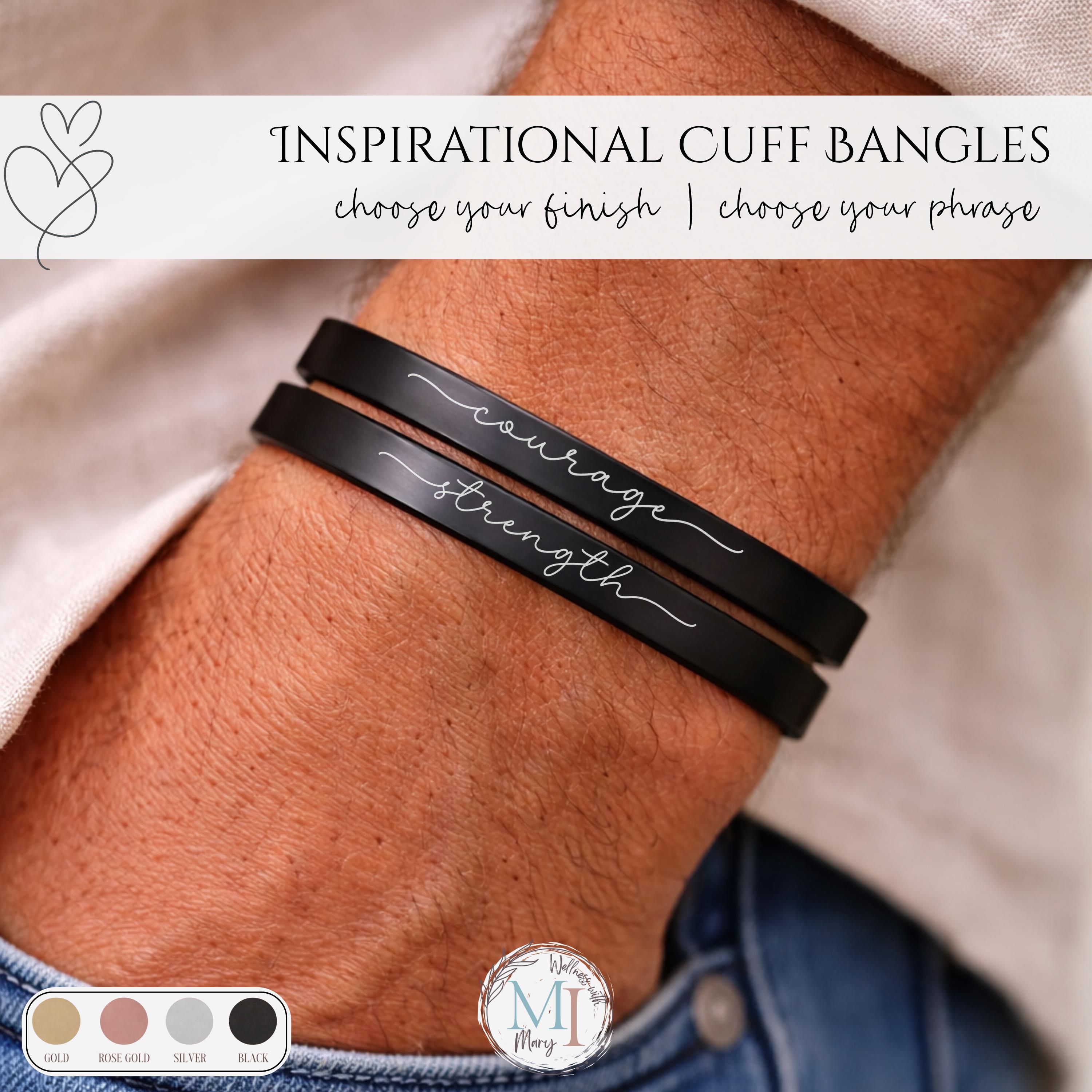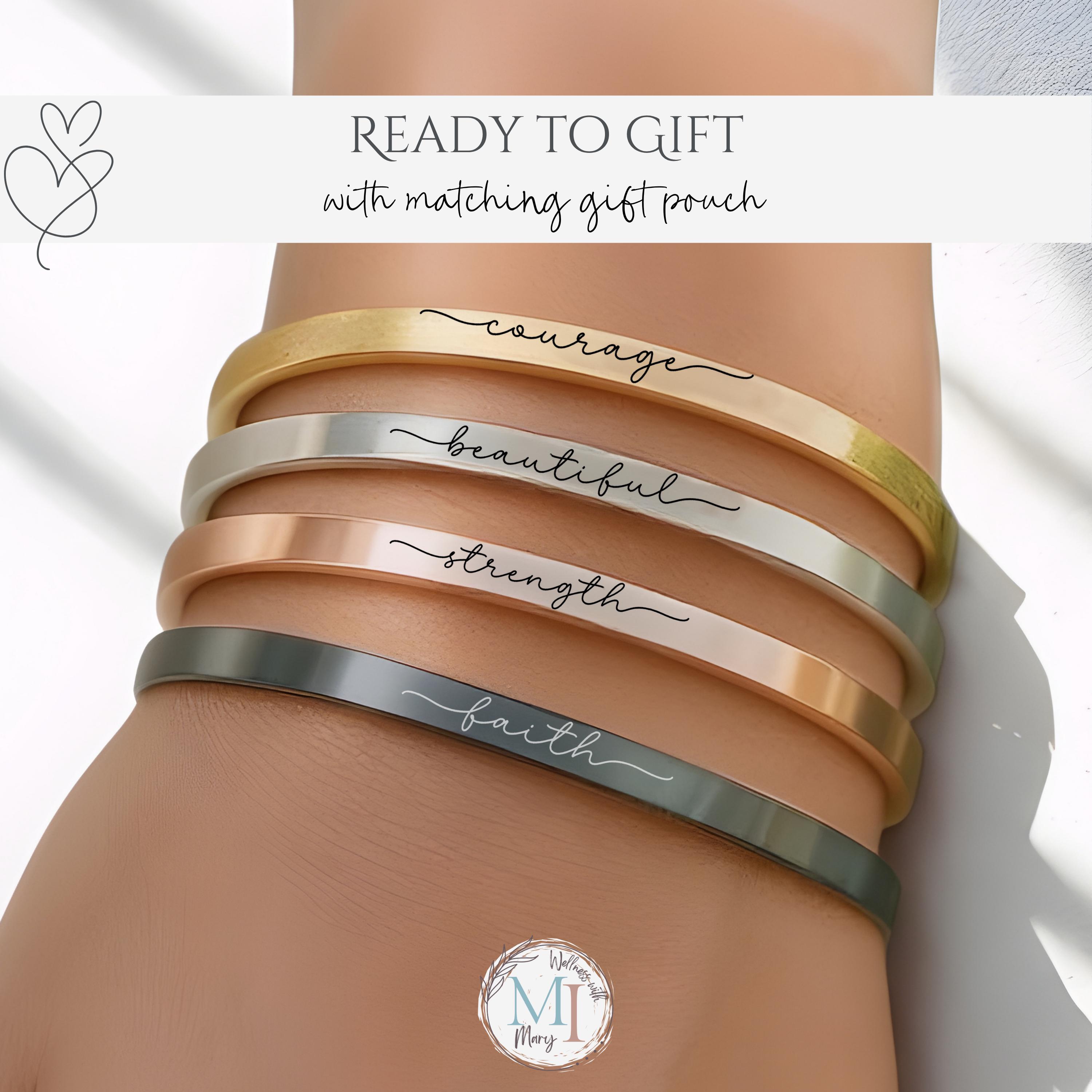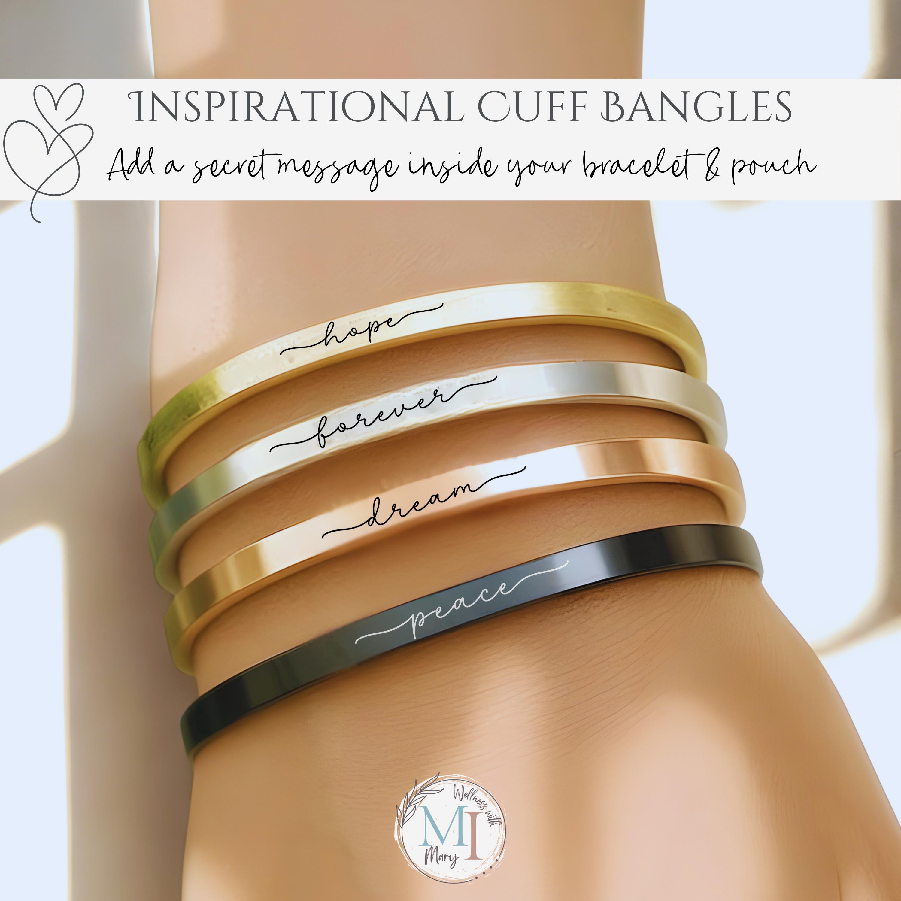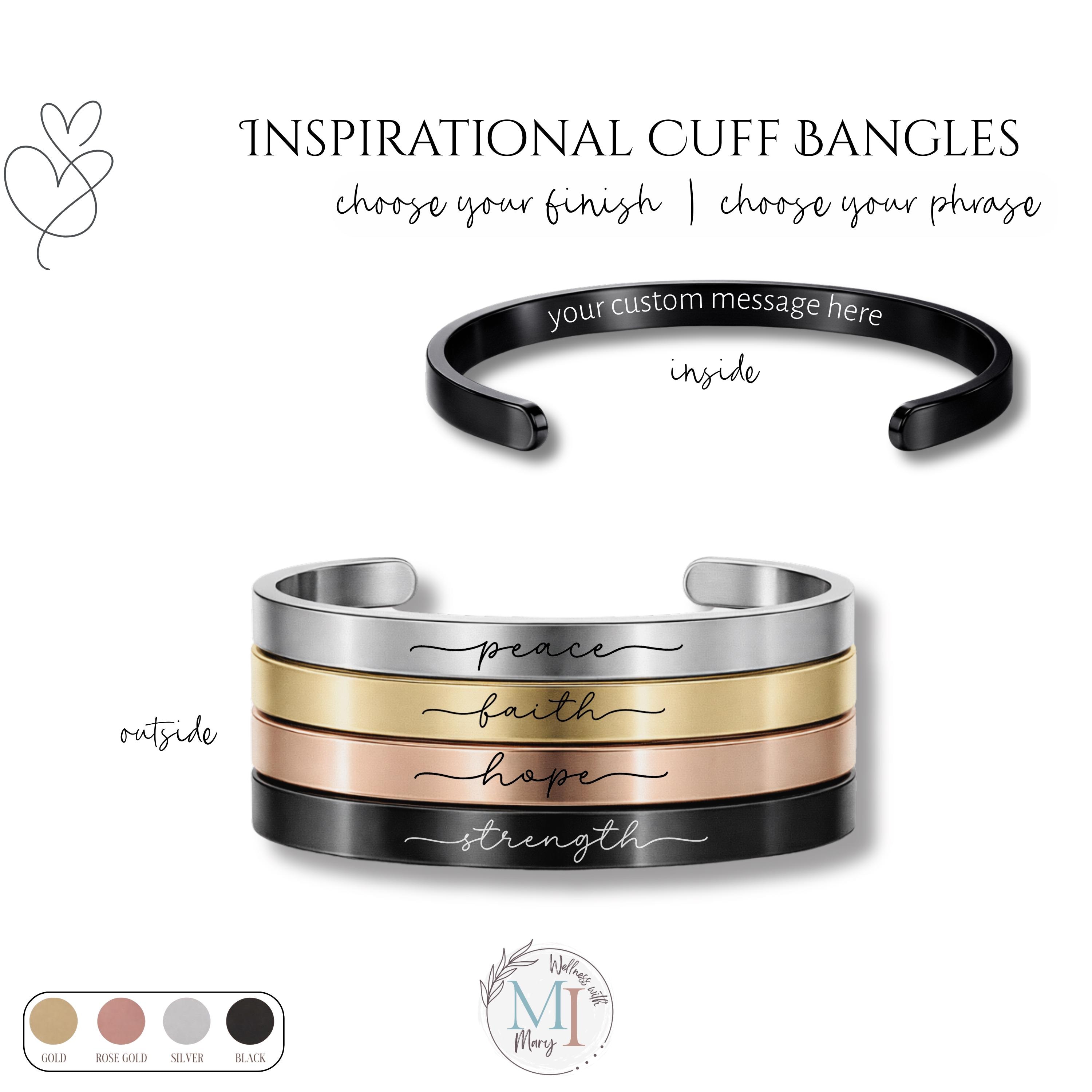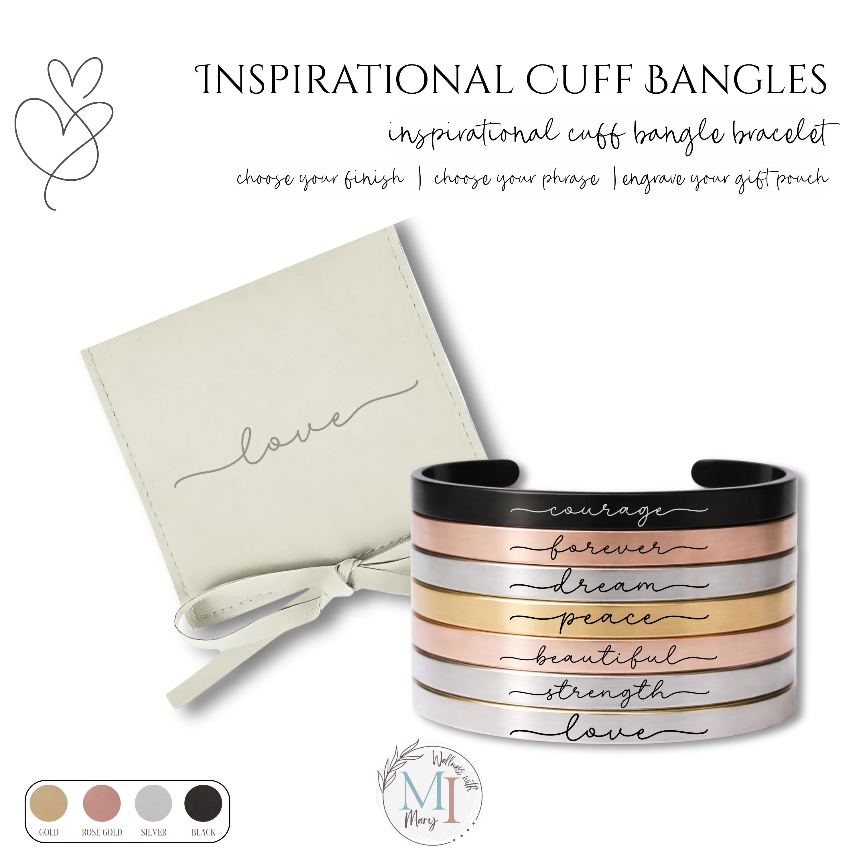 These minimalist 6mm cuff bangles are engraved with your choice of an inspiring word, creating a meaningful, wearable affirmation you (or someone you love) can carry every day.