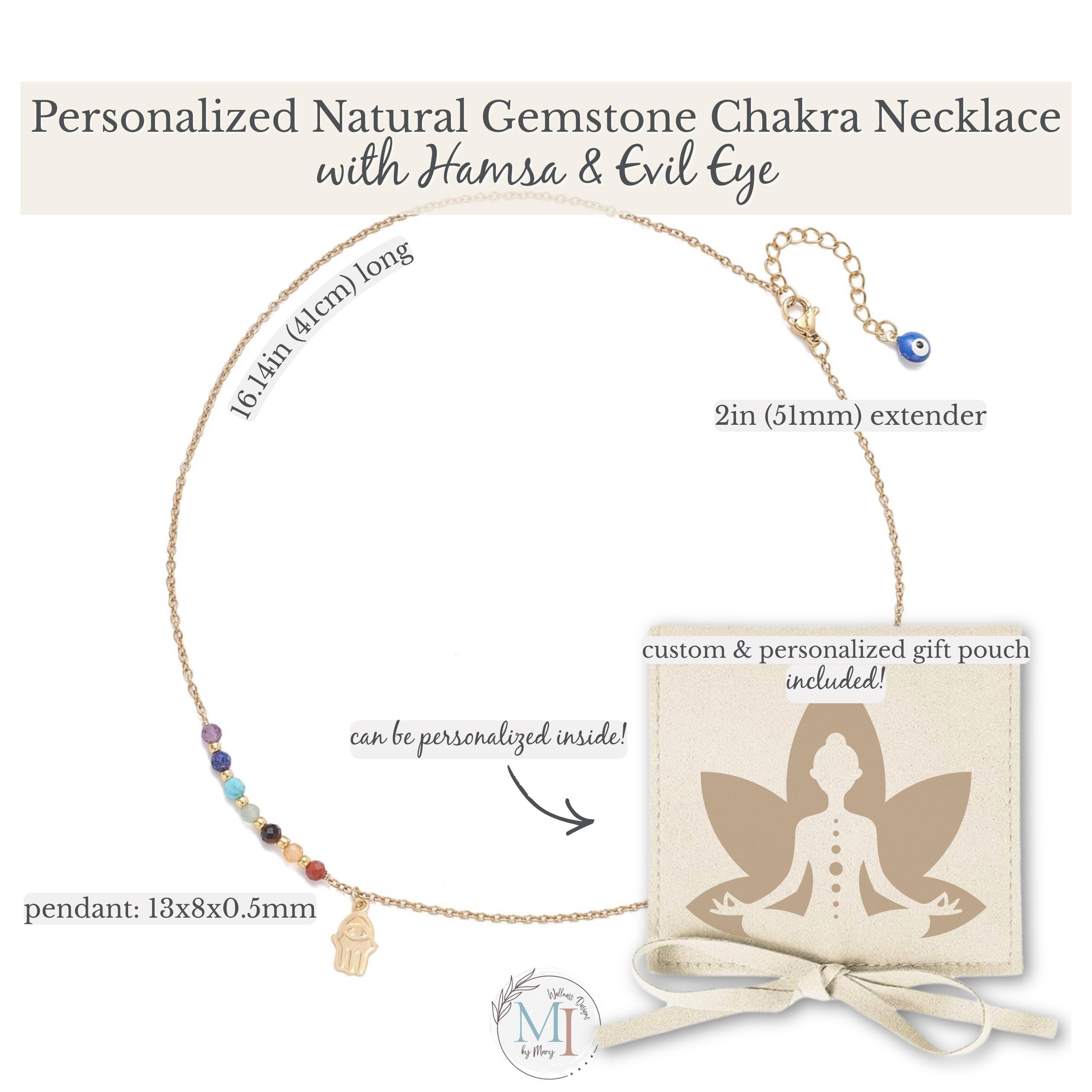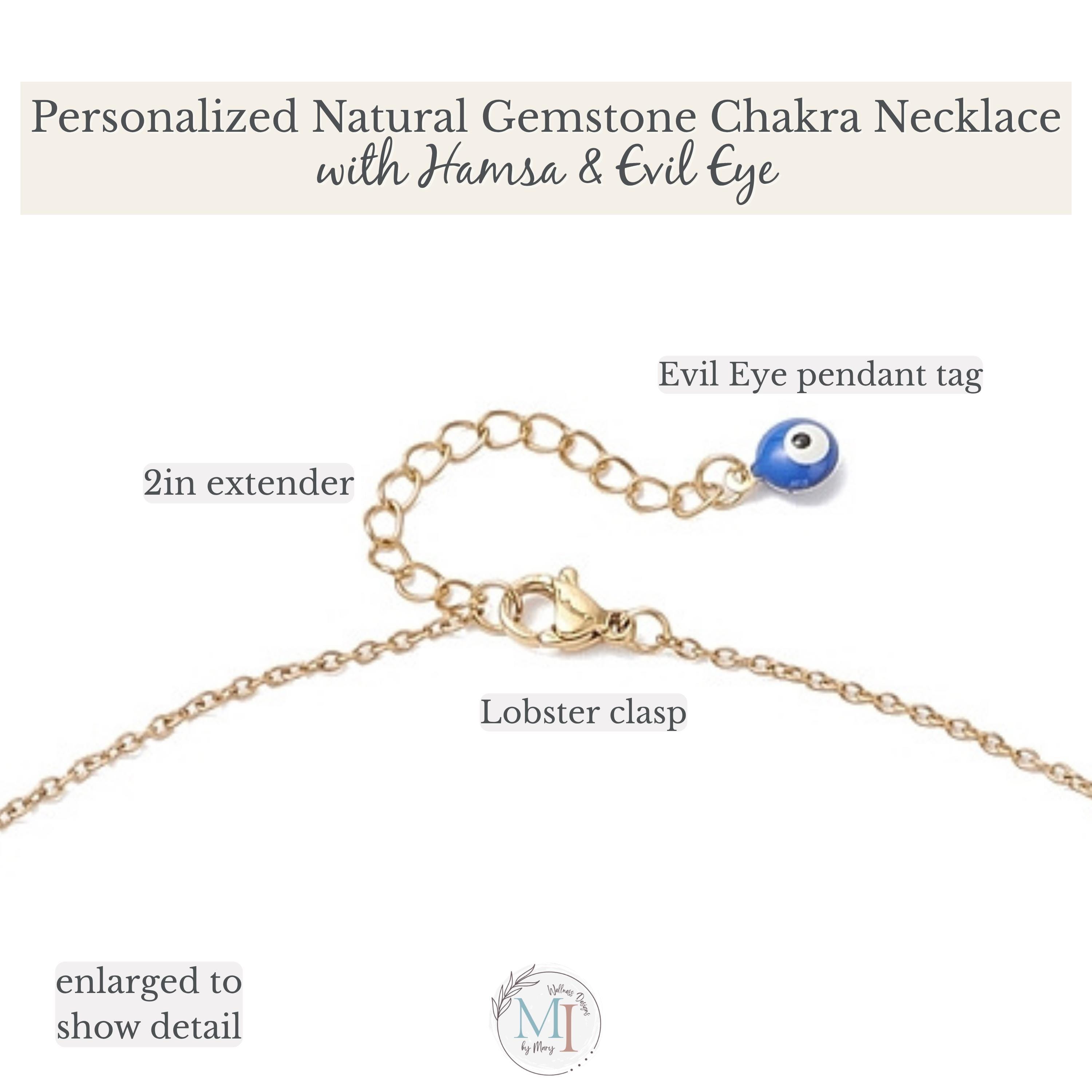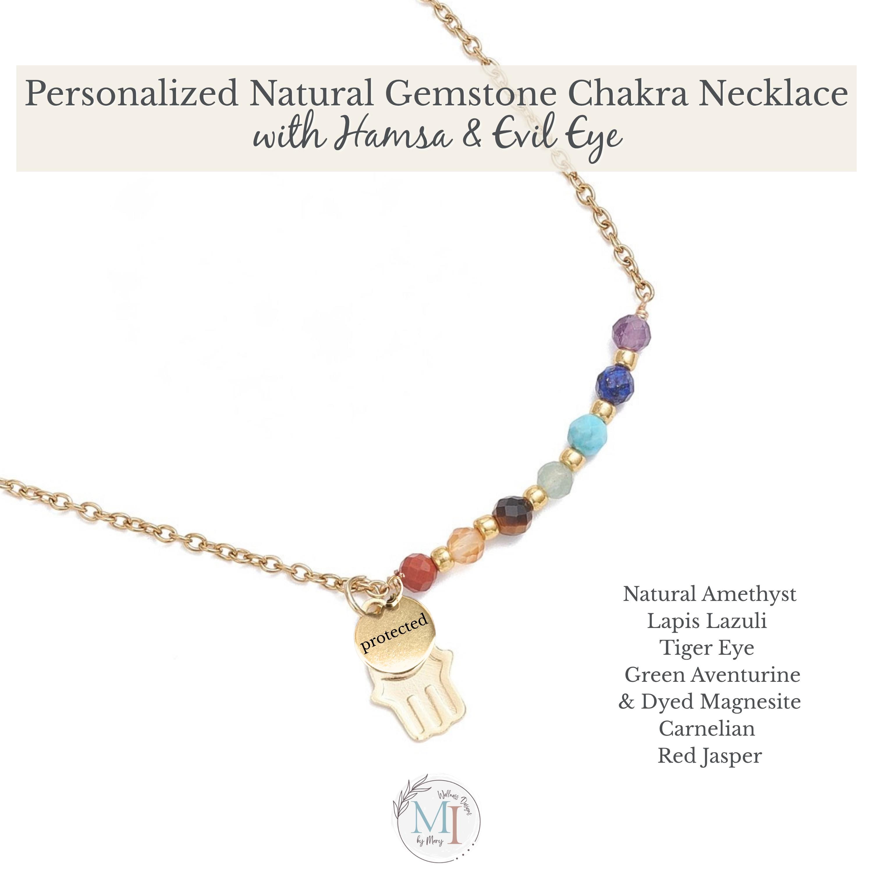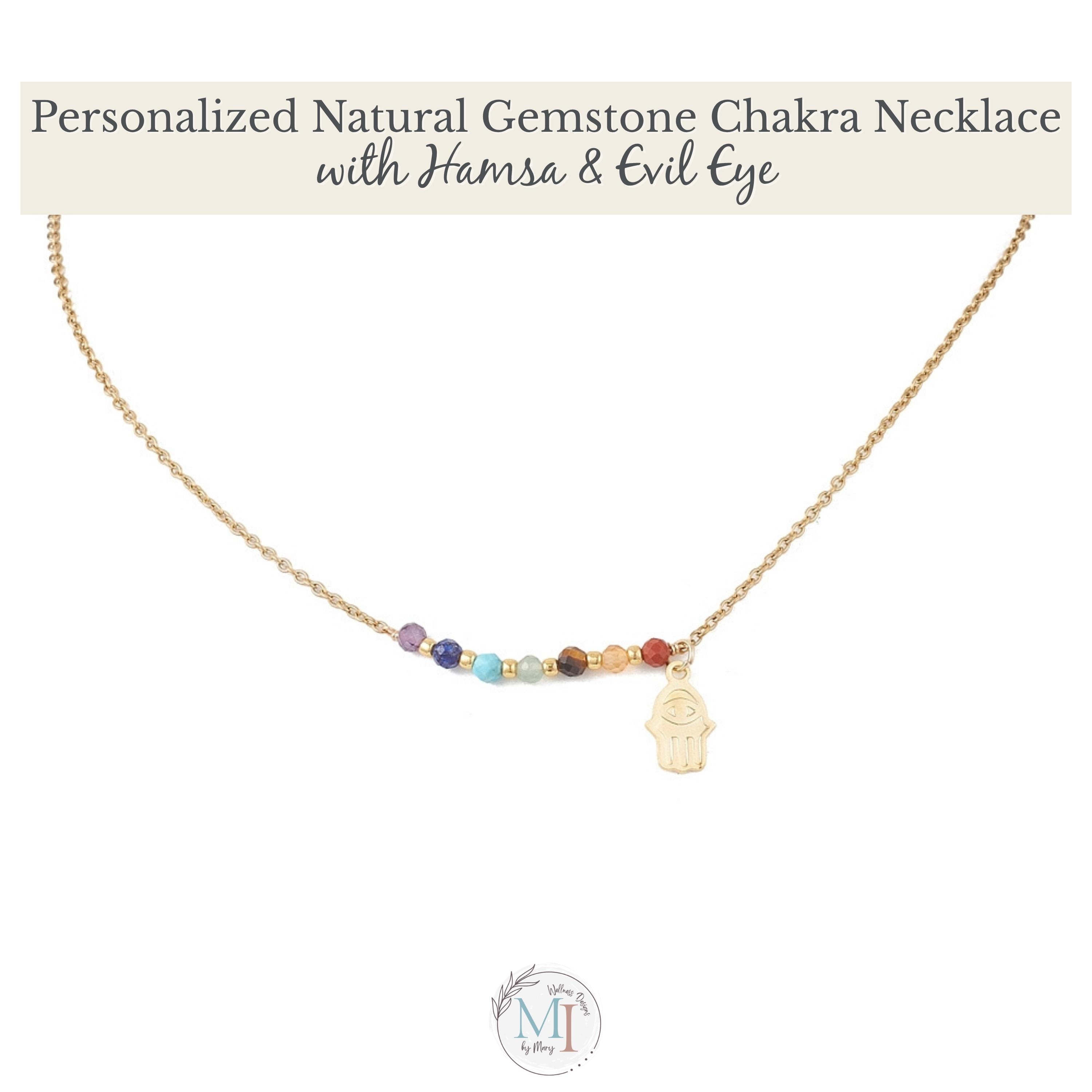 This delicate chakra necklace combines natural gemstones, a protective Hamsa hand, and an evil eye detail—designed to support balance, intention, and everyday wear.