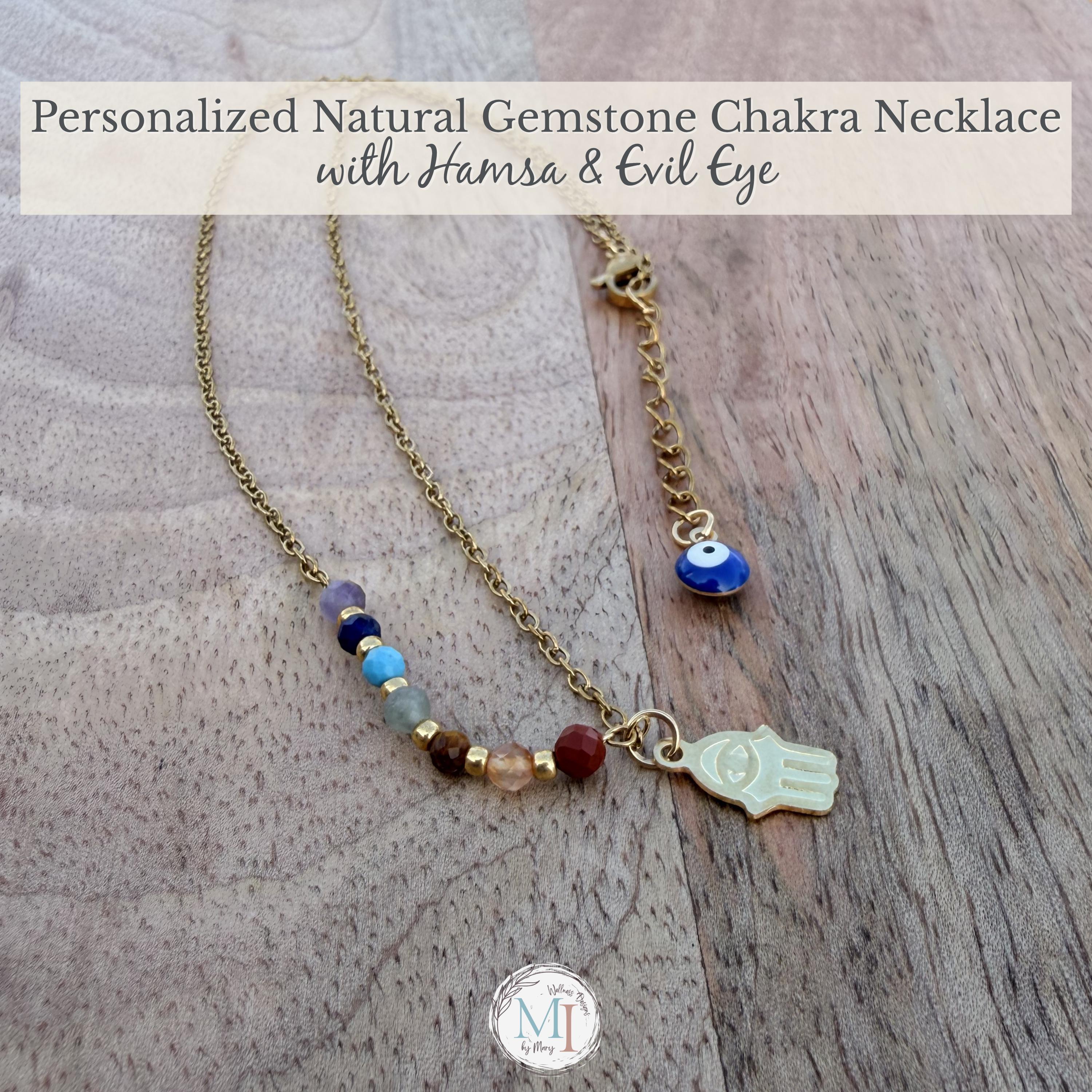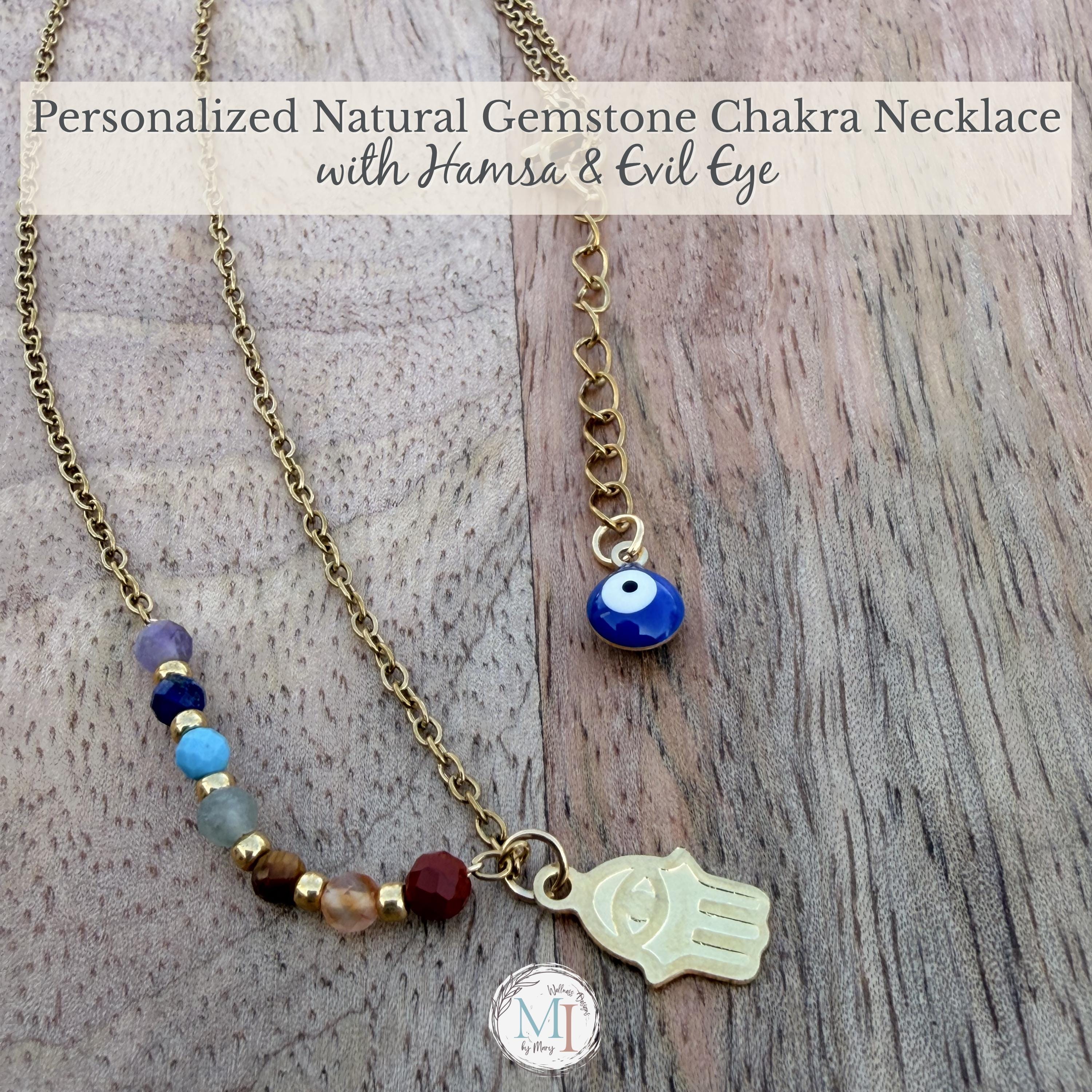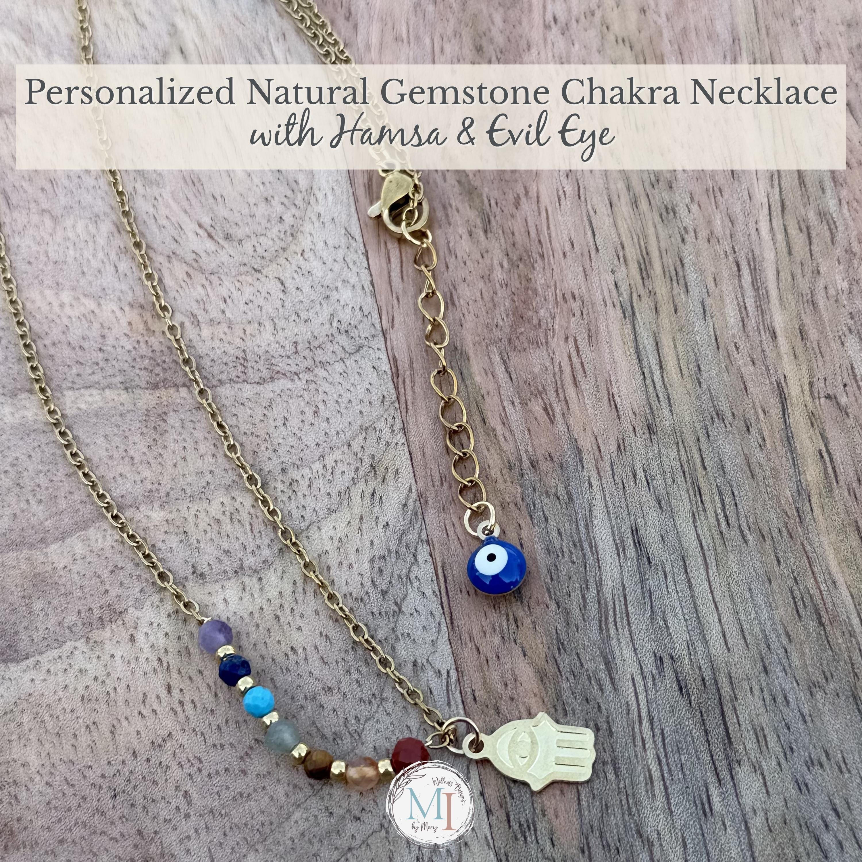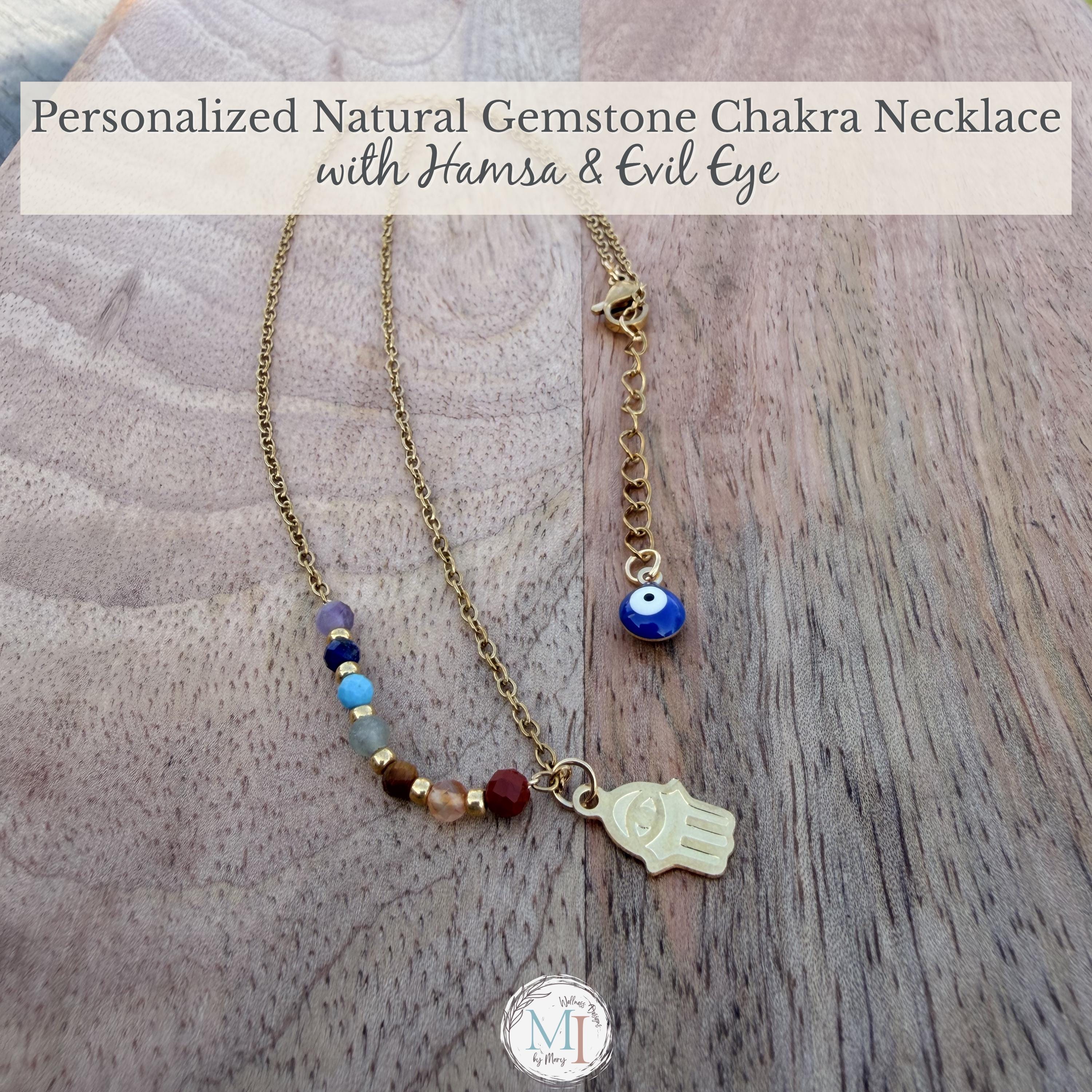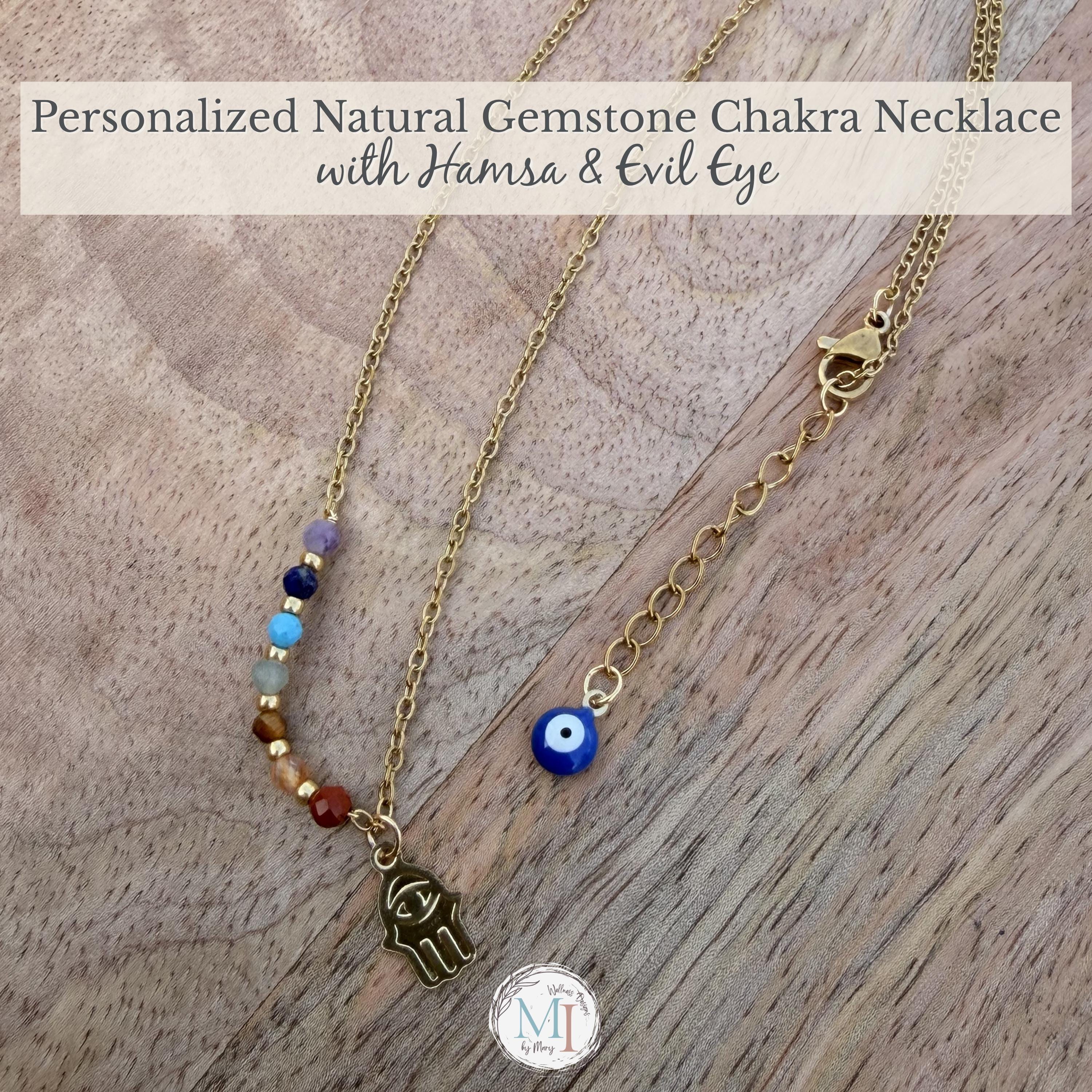 This delicate chakra necklace combines natural gemstones, a protective Hamsa hand, and an evil eye detail—designed to support balance, intention, and everyday wear.