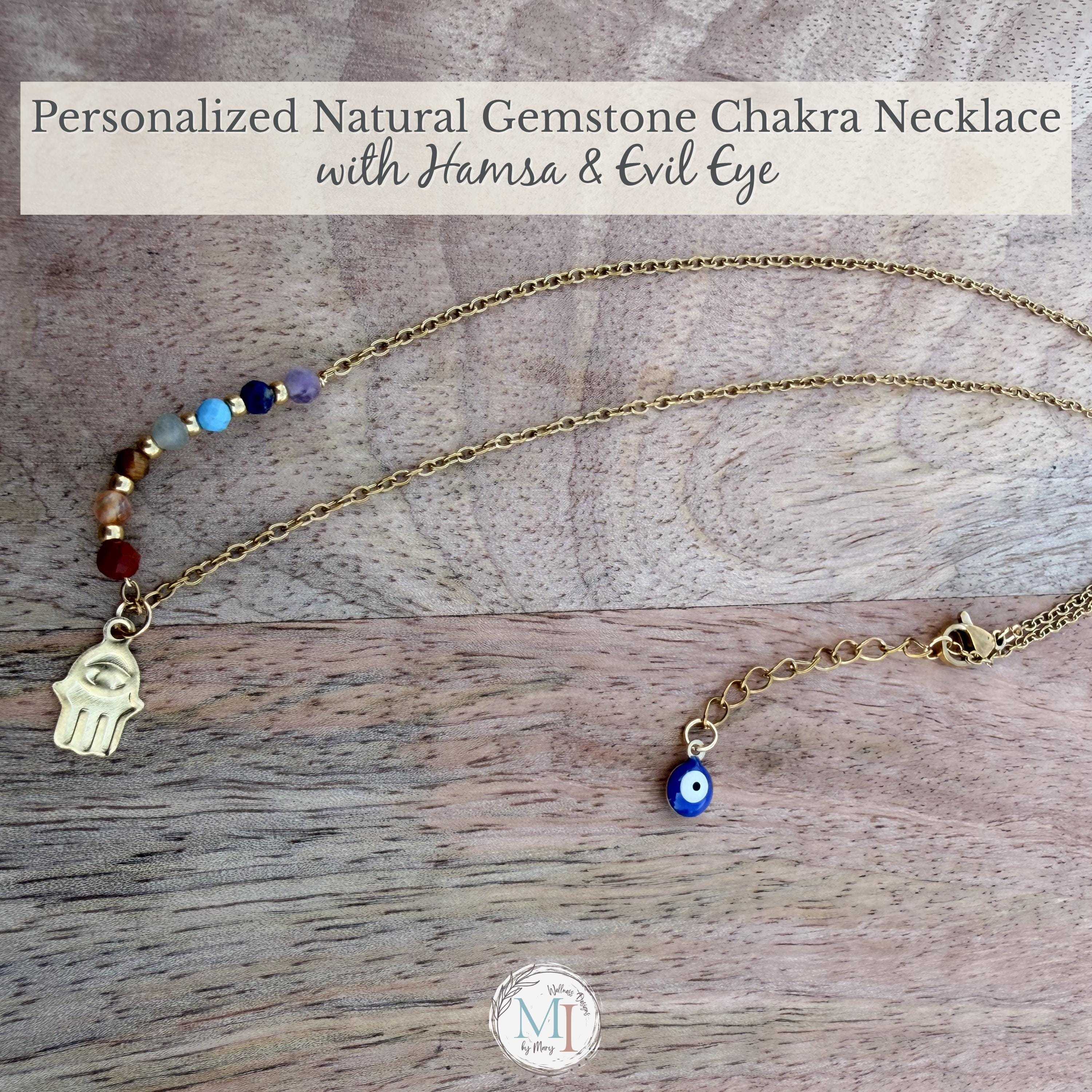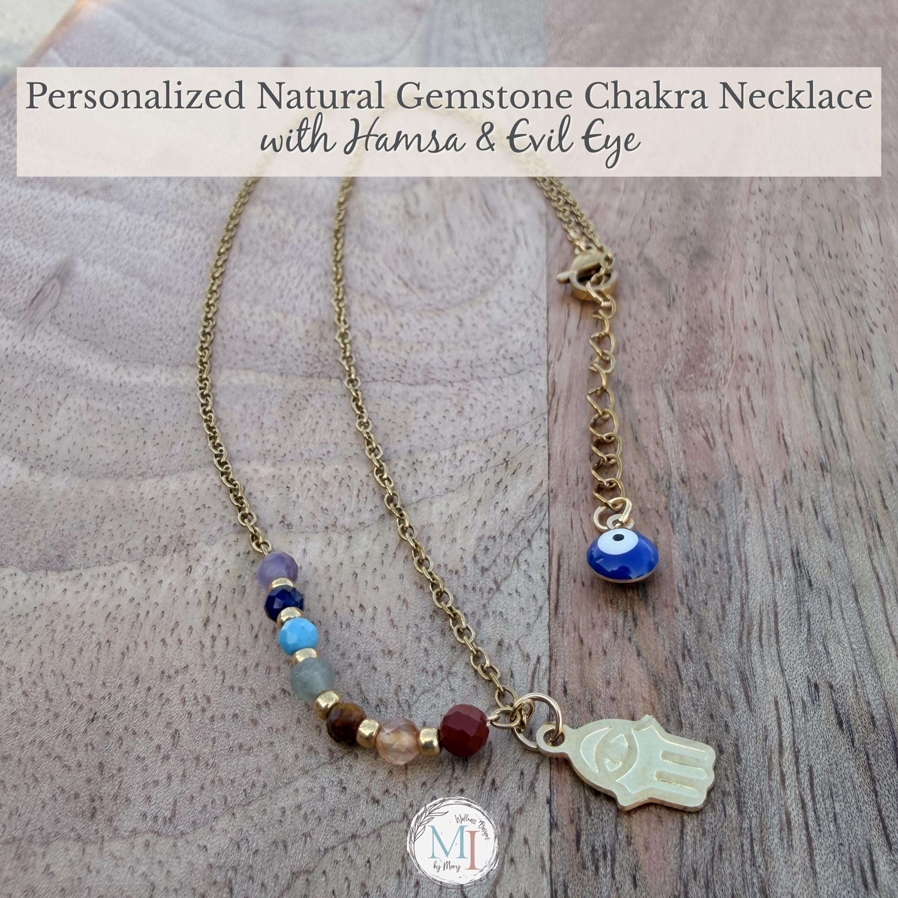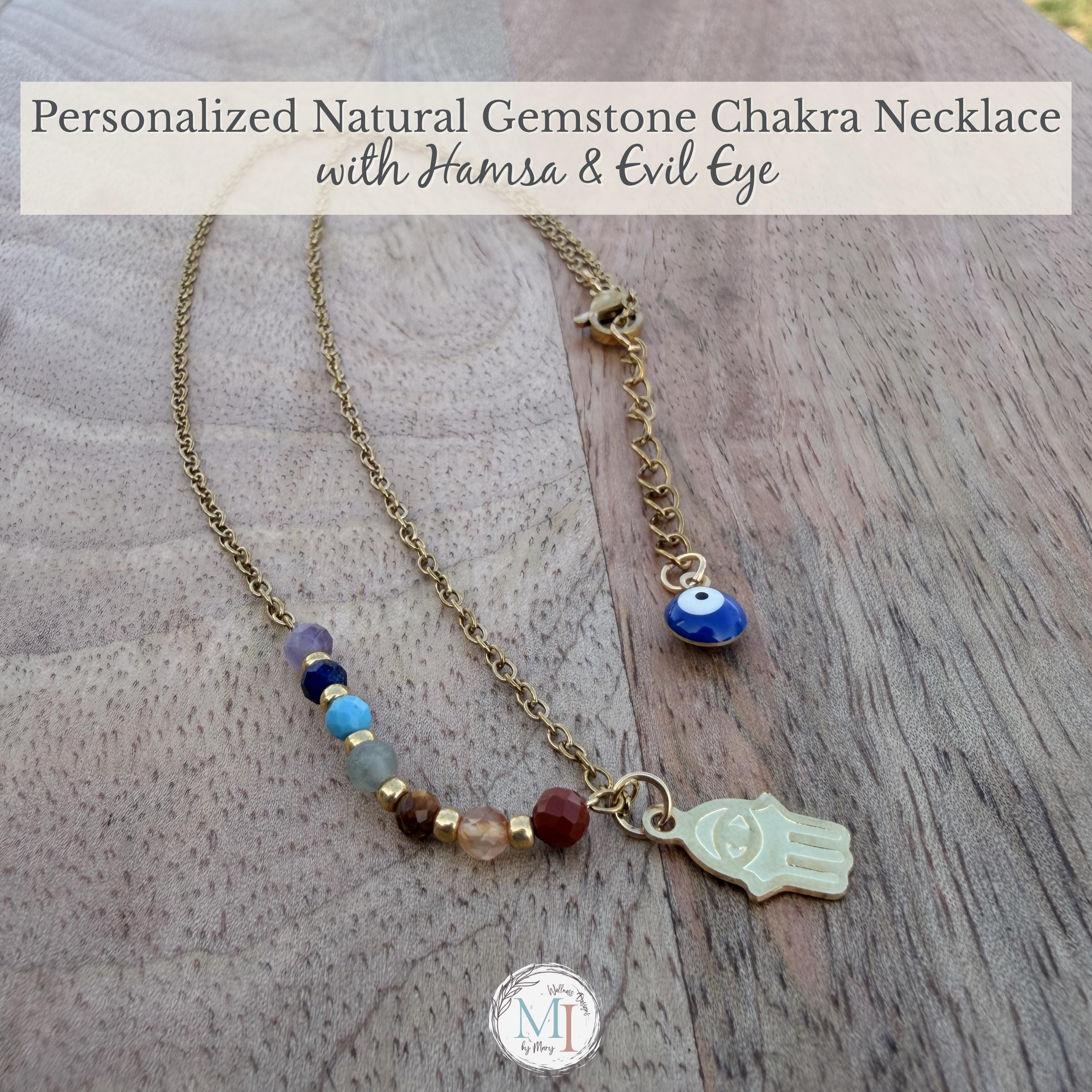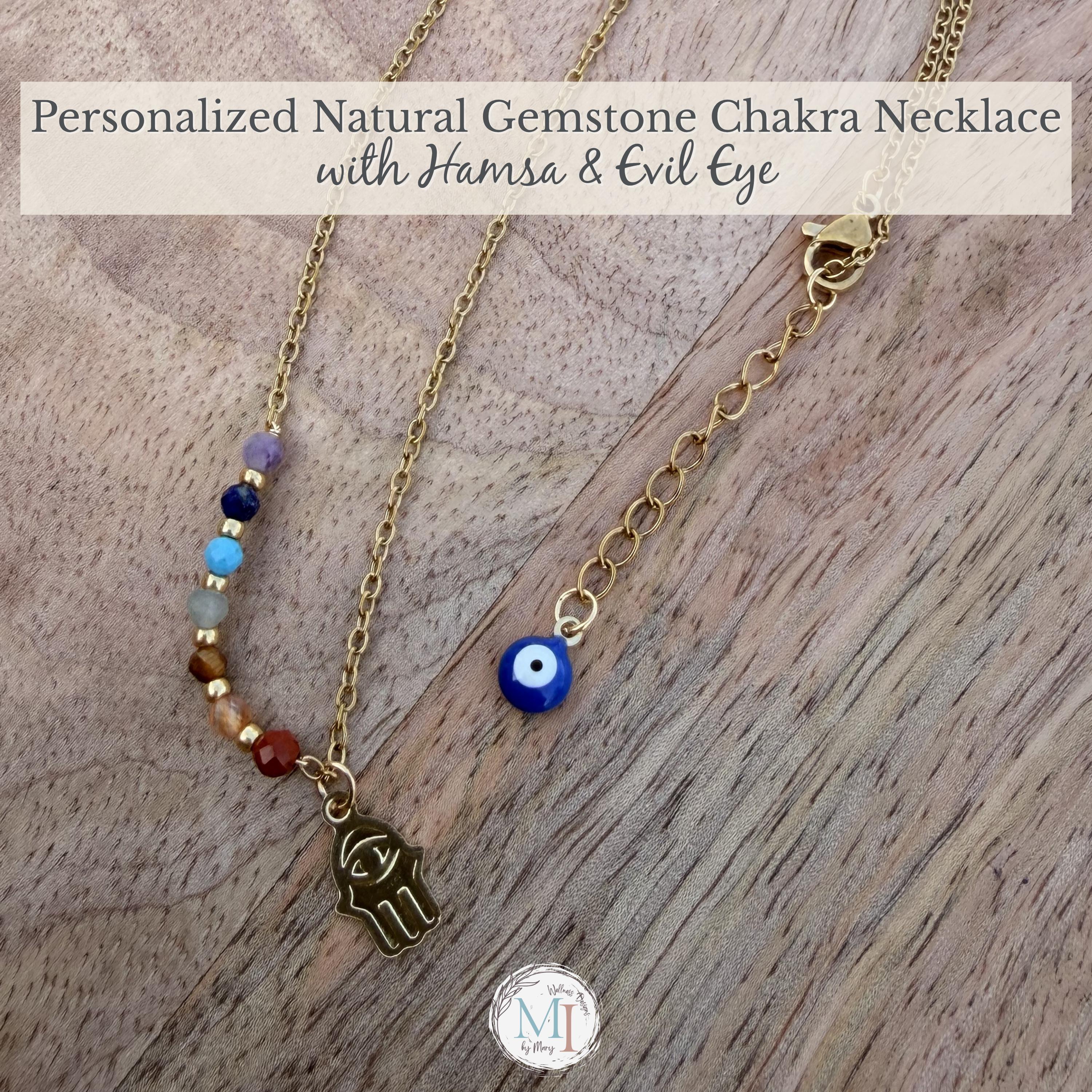This delicate chakra necklace combines natural gemstones, a protective Hamsa hand, and an evil eye detail—designed to support balance, intention, and everyday wear.