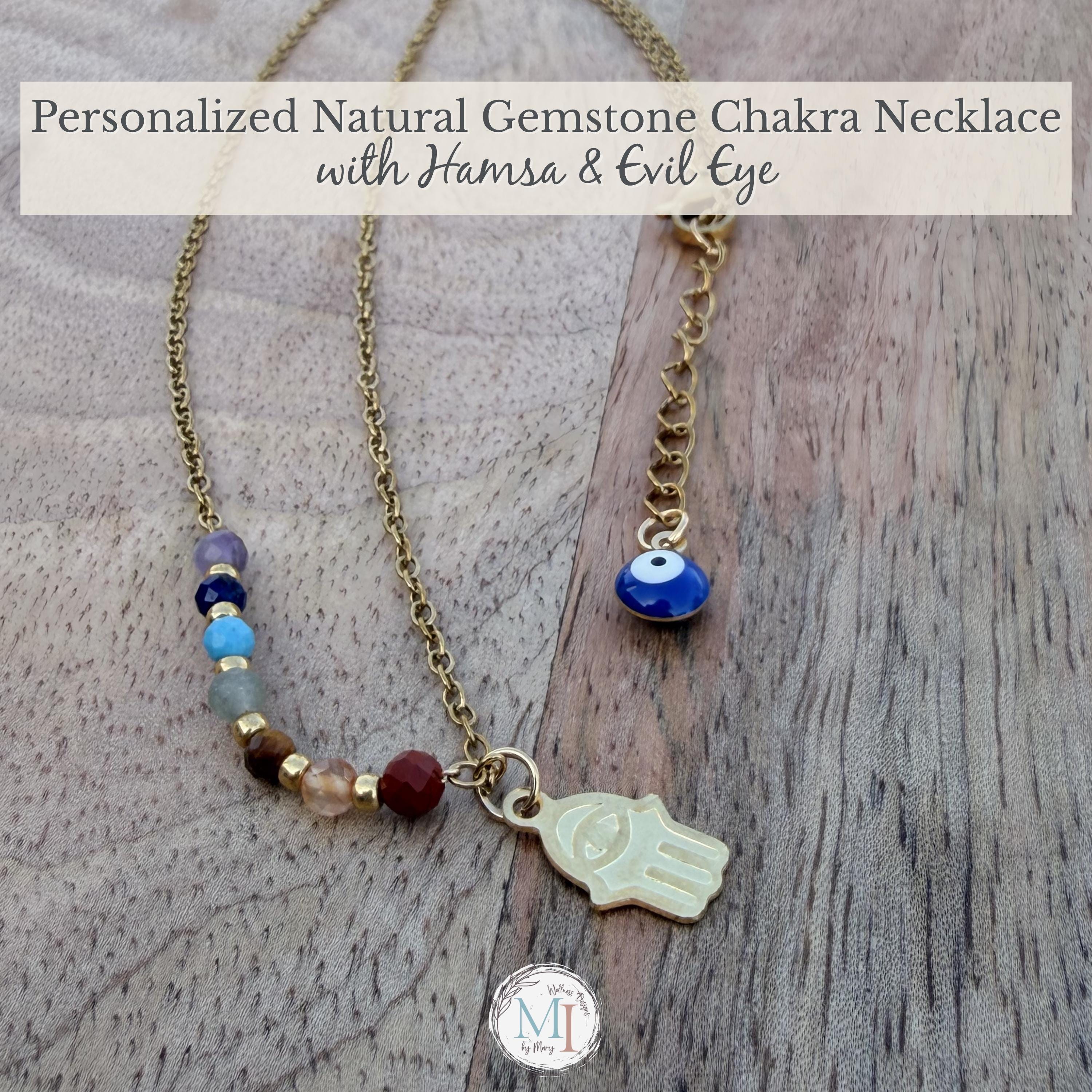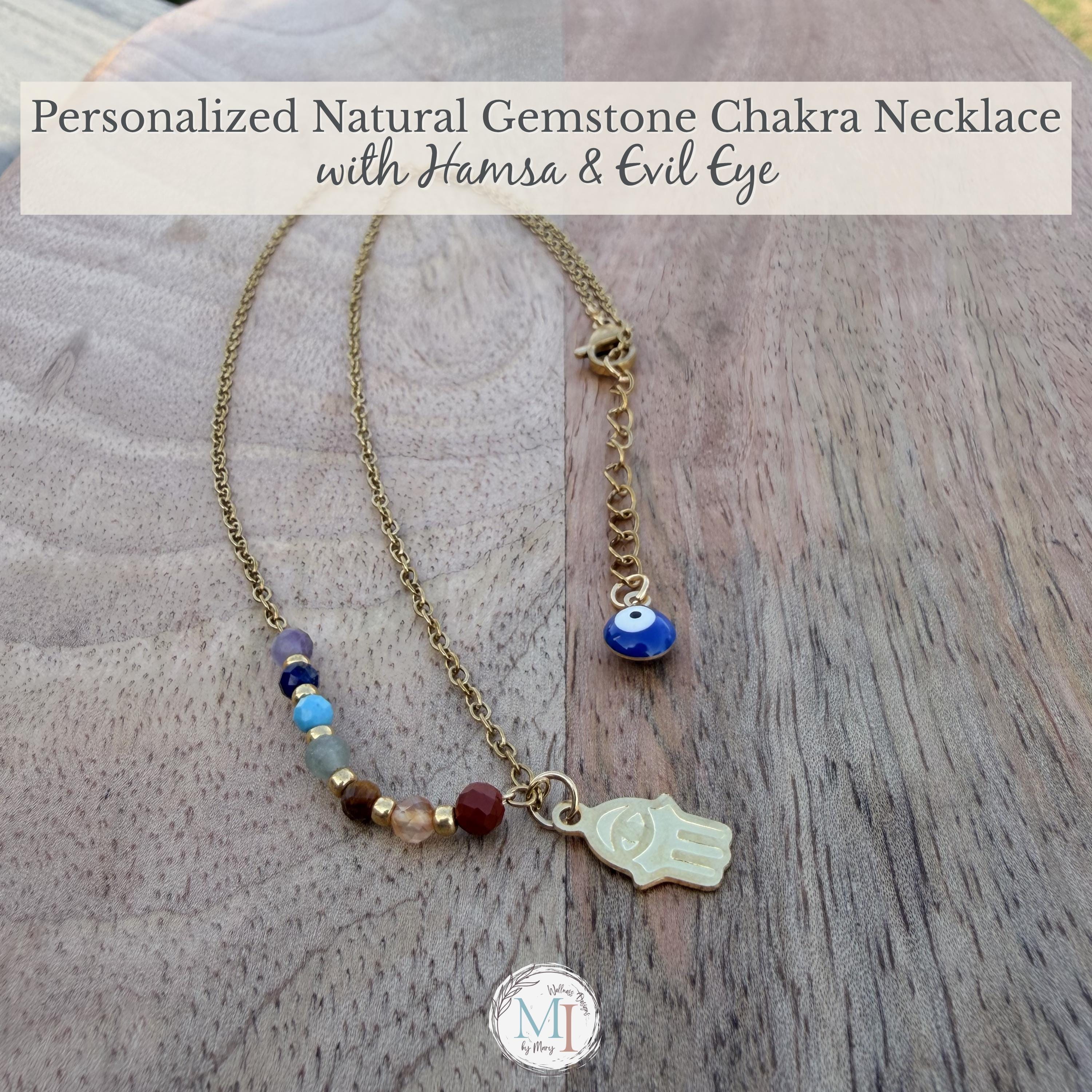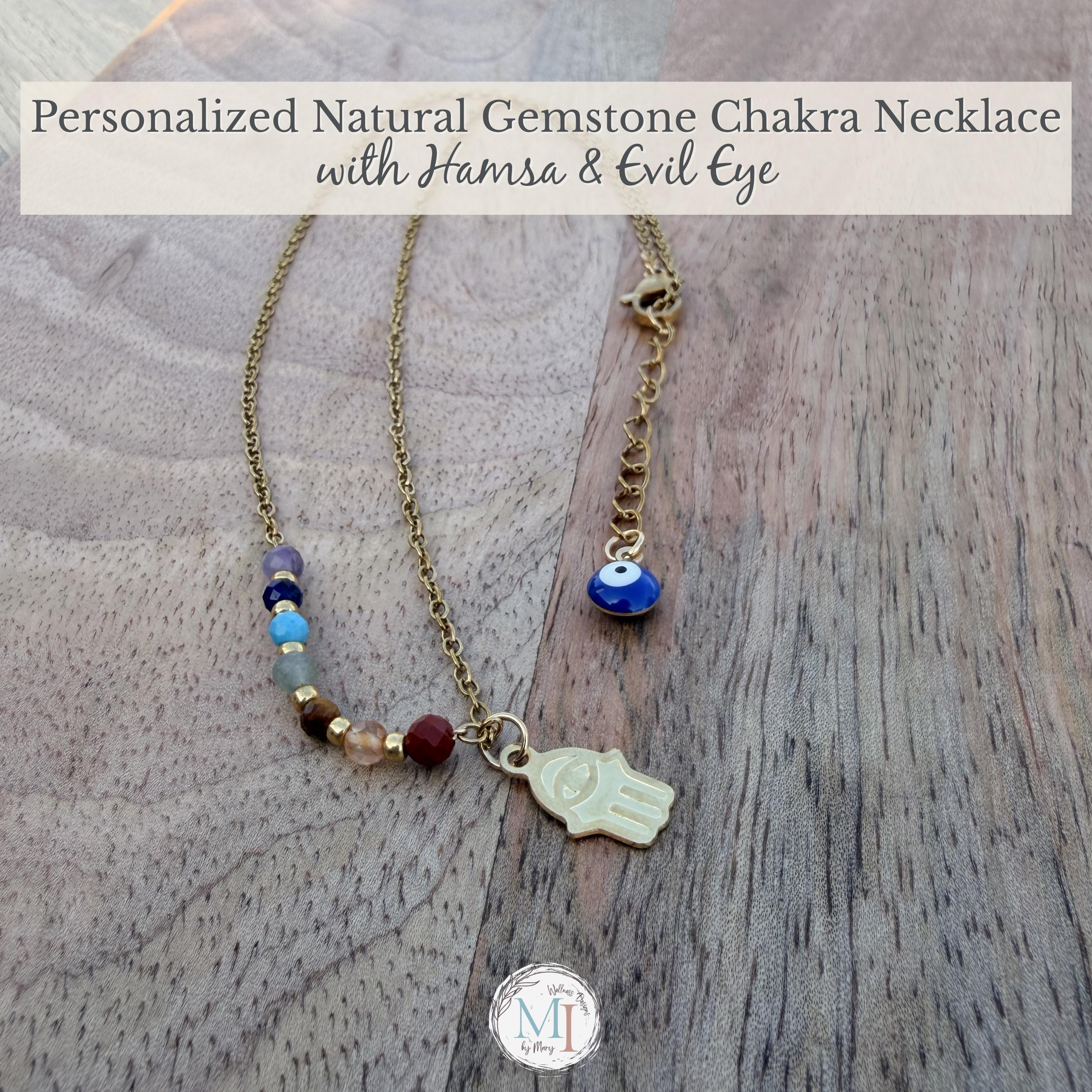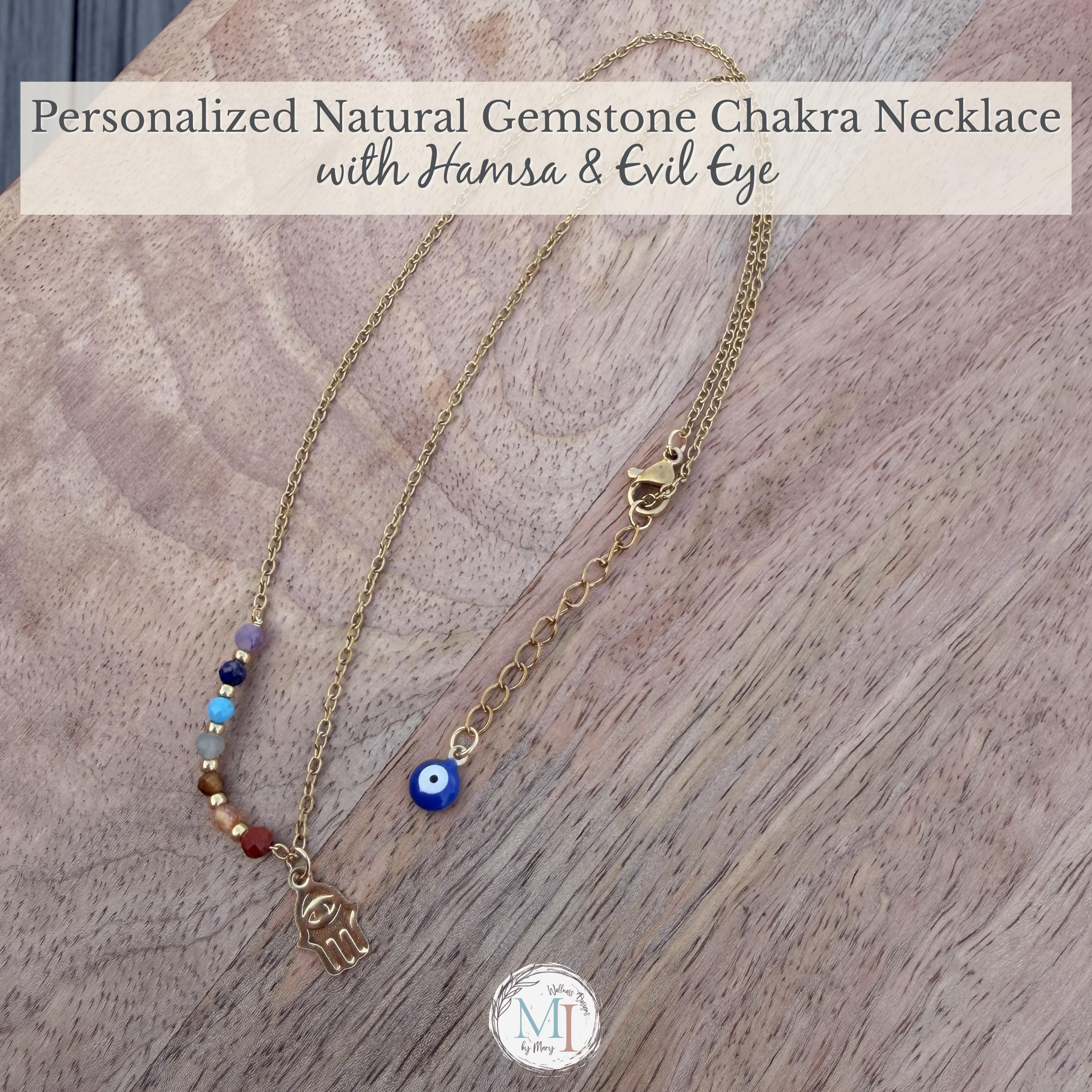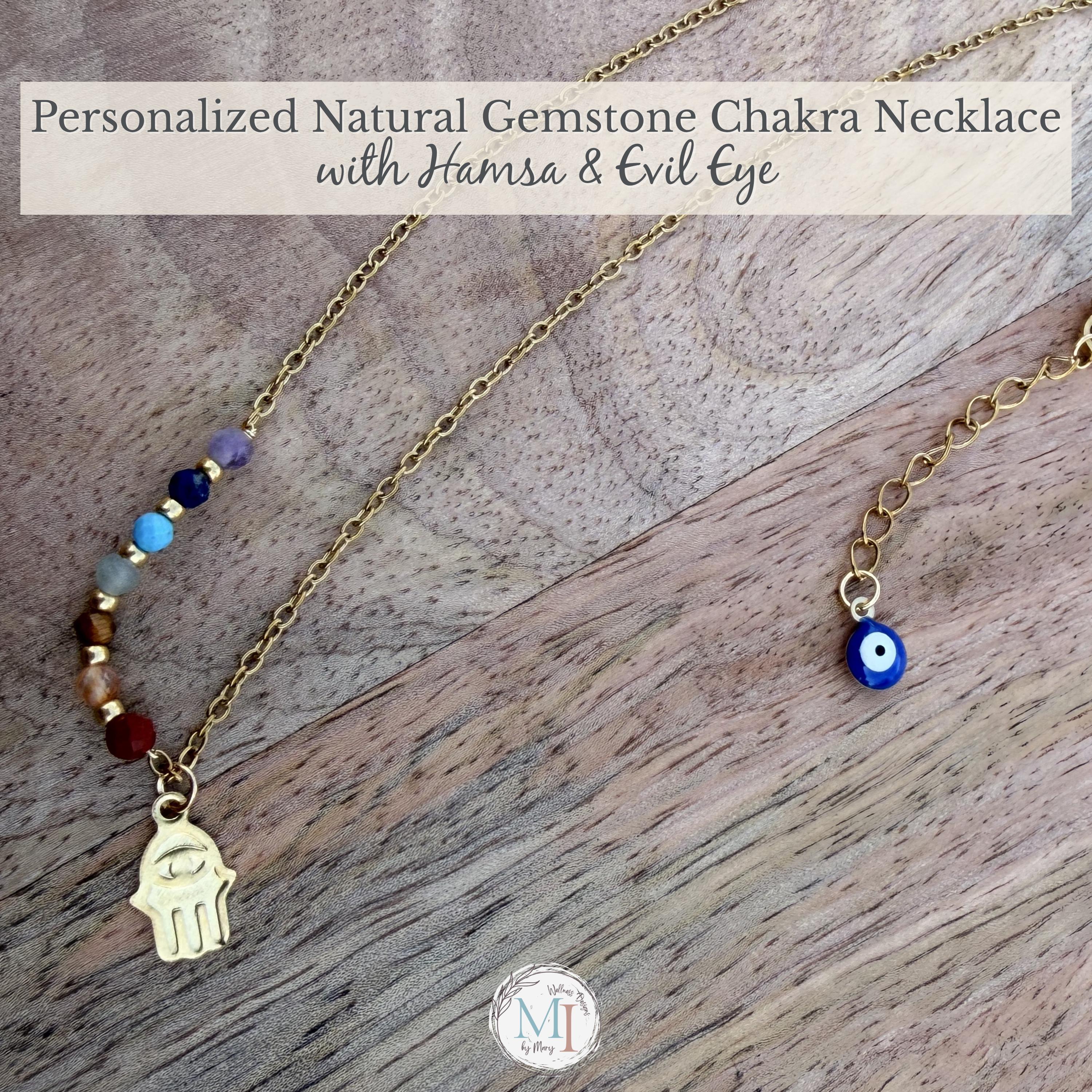 This delicate chakra necklace combines natural gemstones, a protective Hamsa hand, and an evil eye detail—designed to support balance, intention, and everyday wear.